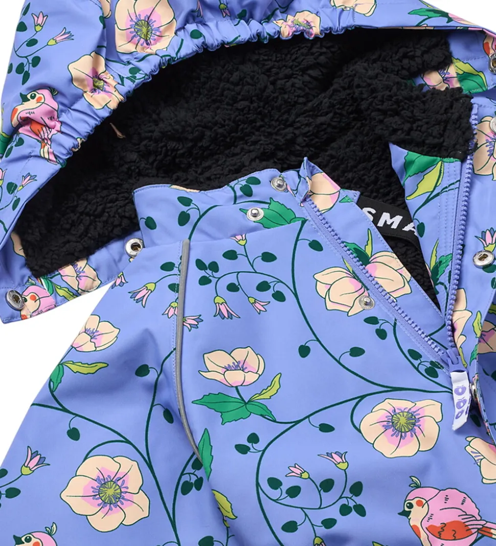 Skøn Småfolk vinterjakke i en smuk lilla nuance med et charmerende blomsterprint og farverige fugle. Rundt om ærmene er der praktiske reflekspipings.