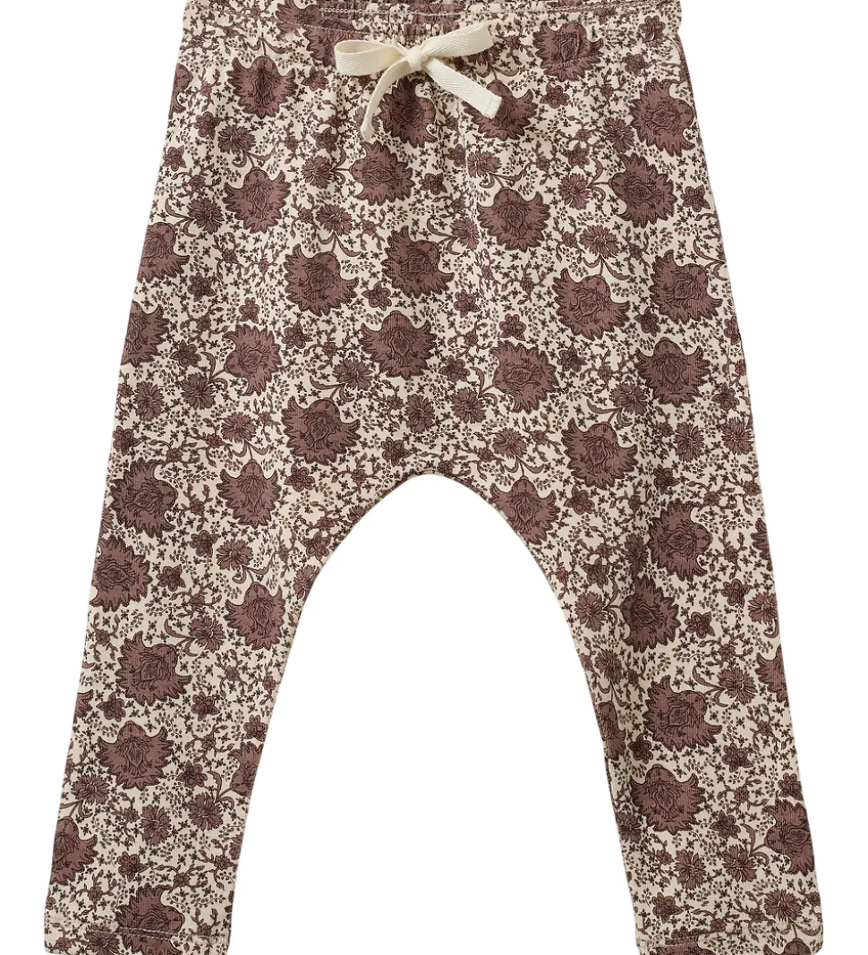 Stilfulde bukser fra Sofie Schnoor, dekoreret med et detaljeret blomstermønster i mørkerosa og beige nuancer. Bukserne har en elastisk talje med snører i fronten, hvilket giver et justerbart fit. Buksebenene afsluttes uden ribkanter for et mere afslappet look.