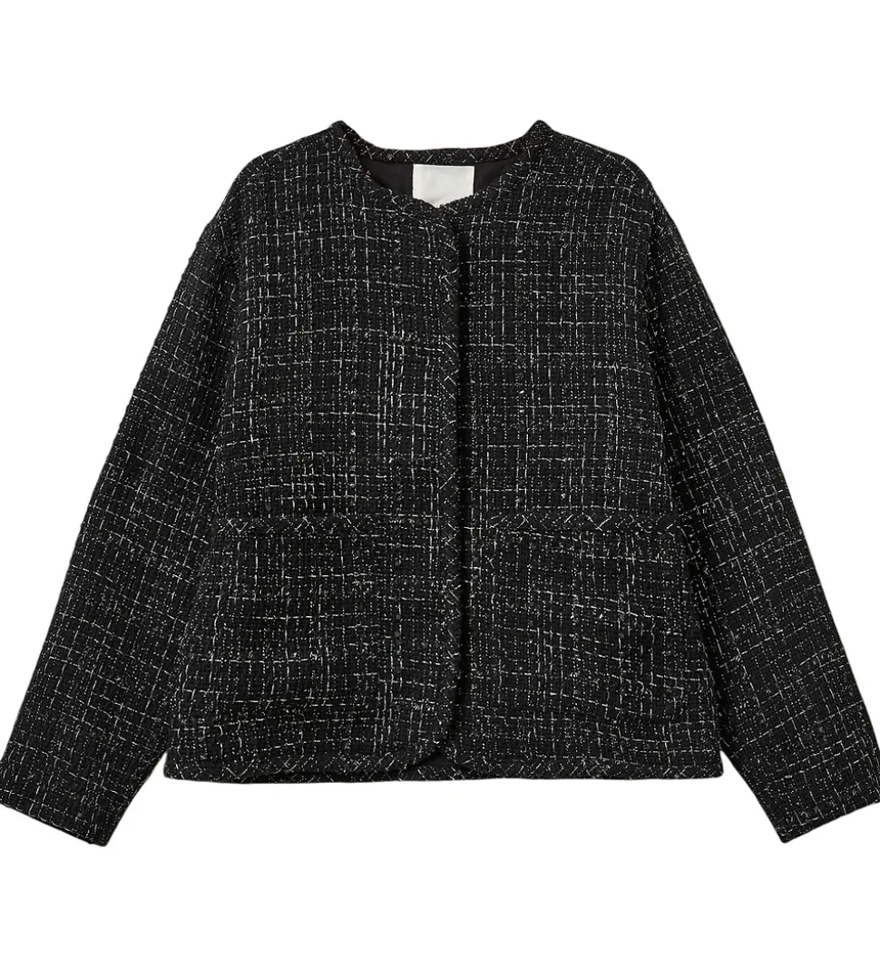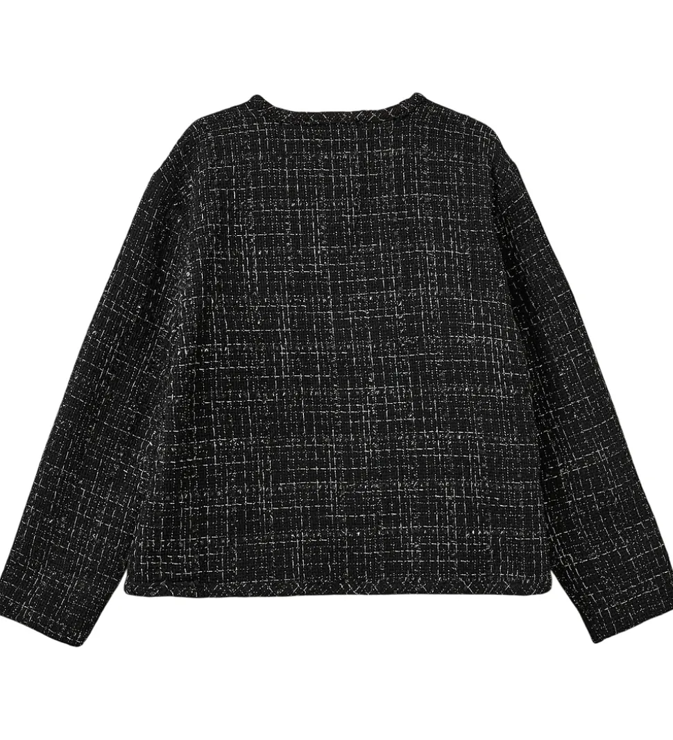 Elegant Sofie Schnoor overgangsjakke i en klassisk sort nuance med sølvglimmer-tern. Sofie Schnoor jakken har lange ærmer og en enkel forside, hvilket giver et stilrent udtryk. Perfekt til de køligere dage.