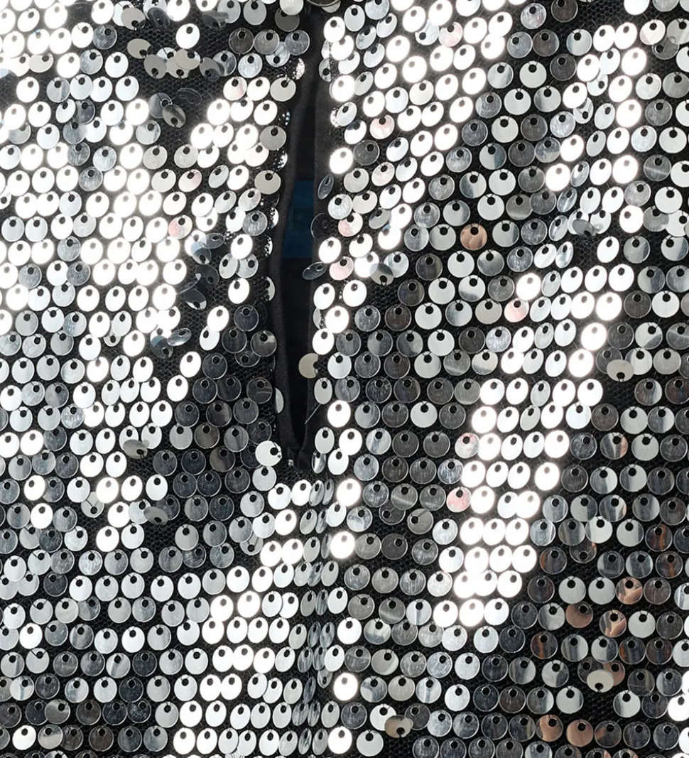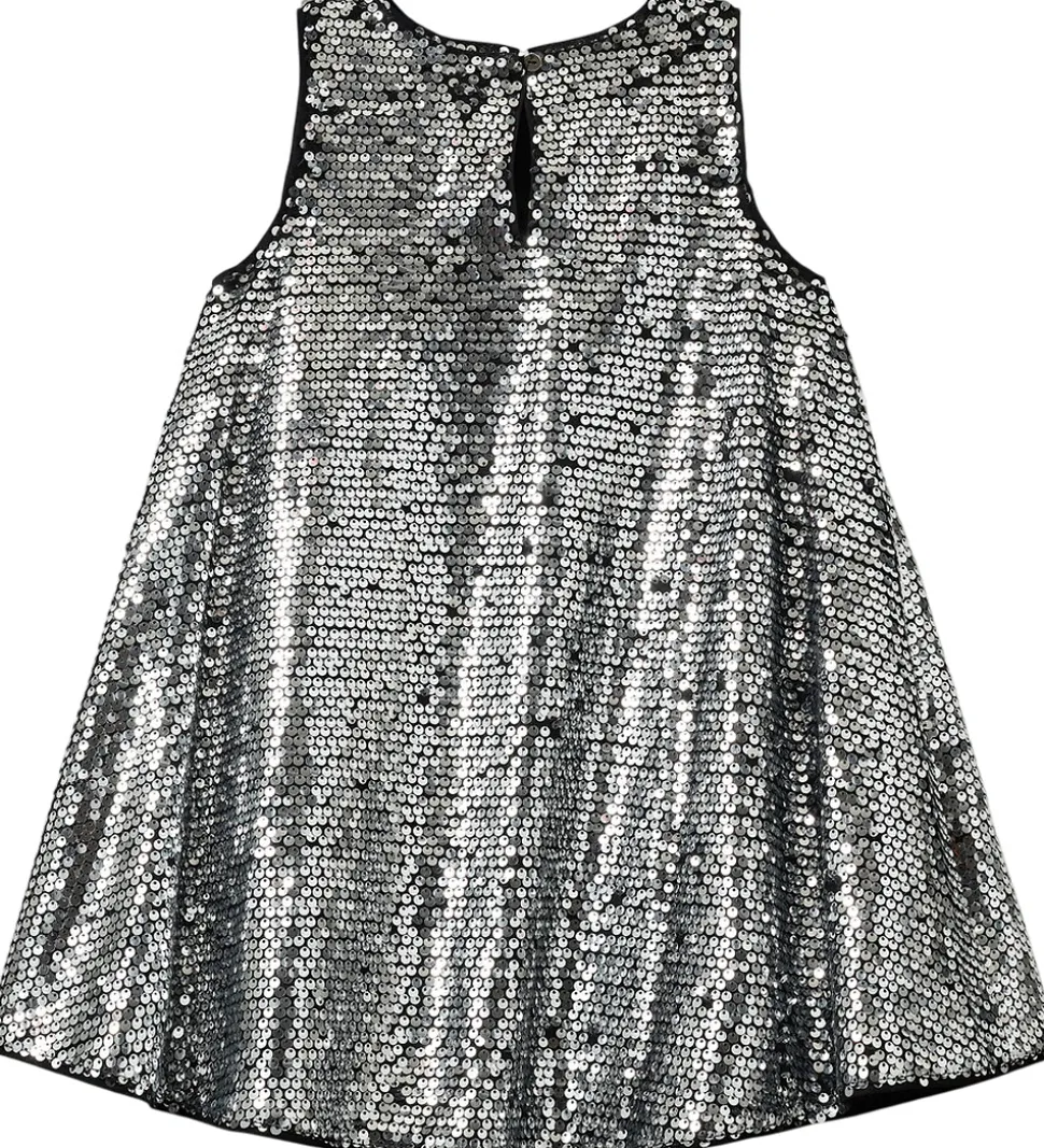 Glimrende Sofie Schnoor kjole med et væld af sølvpailletter, der dækker hele kjolens overflade. Sofie Schnoor kjolen har et ærmeløst design og en rund halsudskæring, som giver den et let og elegant udtryk.