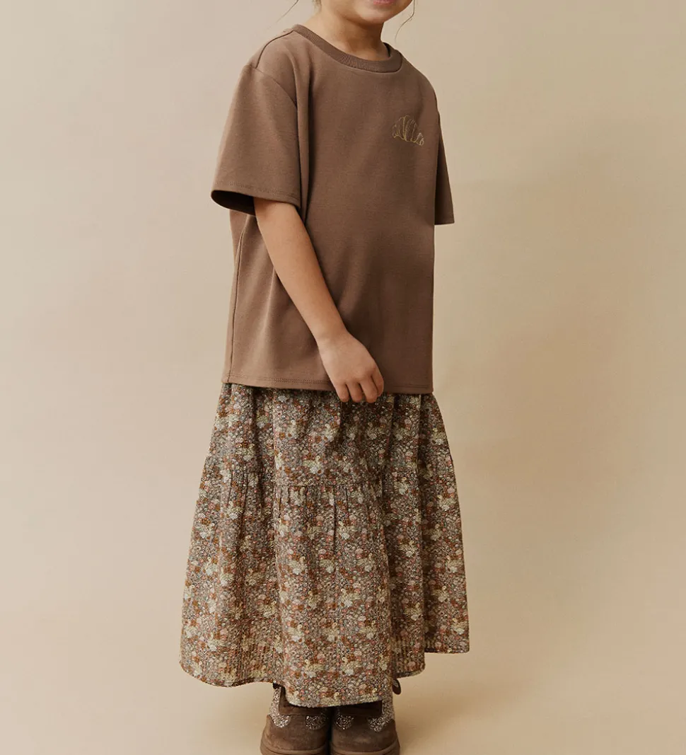 Charmerende Sofie Schnoor nederdel i brun med et detaljeret blomsterprint med ænder og muslinger i rosa, orange og gule nuancer.