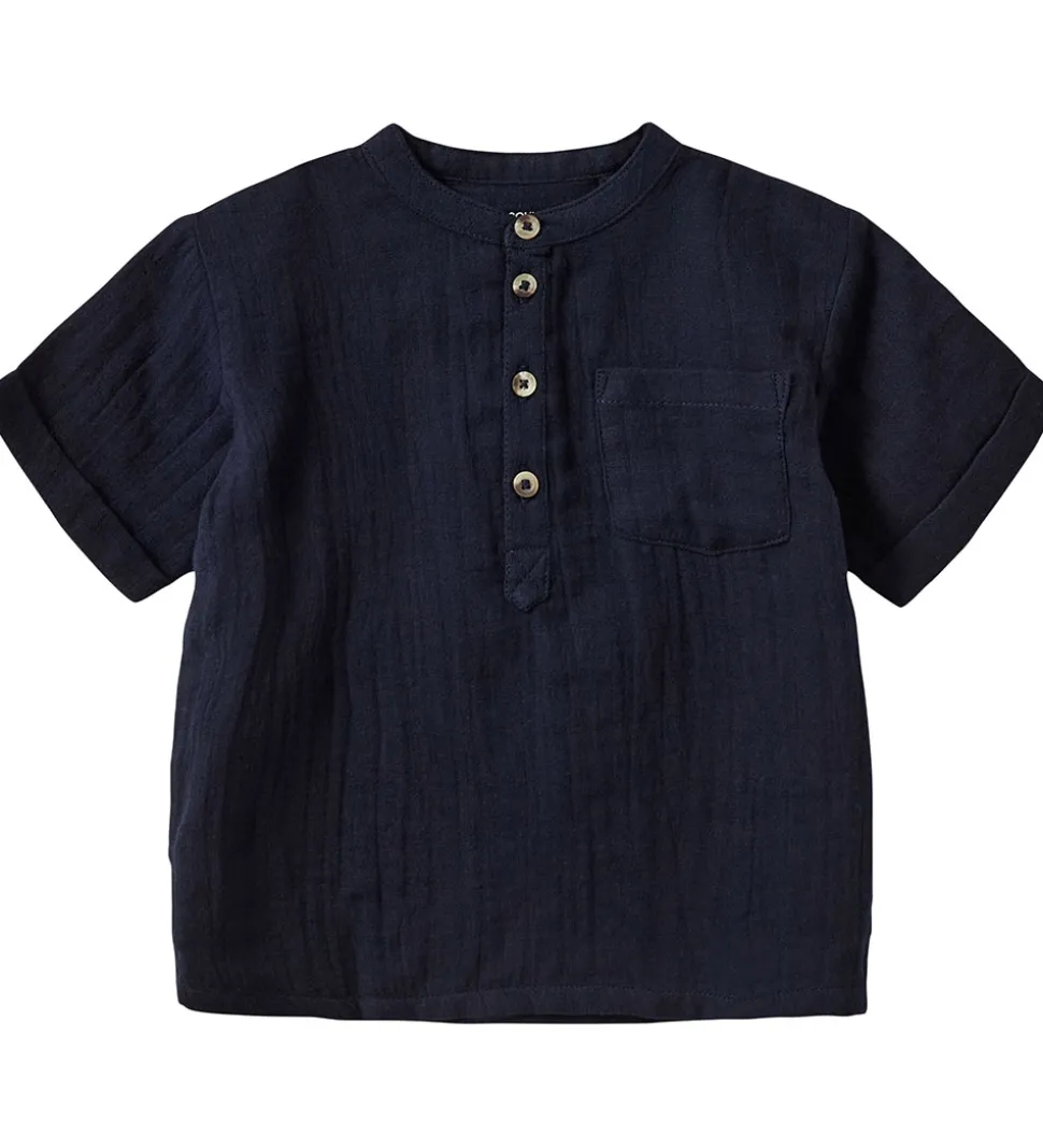 Sofie Schnoor skjorten har korte ærmer med fine fastsyet ombuk, og i halsåbningen er der en flot kinakrave. Fortil åbnes skjorten ned til midt på sjorten med knapper i en stolpelukning. Skjorten er i en blød, fastvævet bomuldskvalitet.