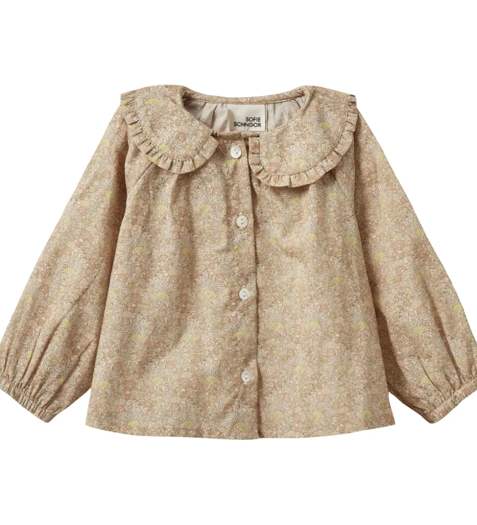 Elegant Sofie Schnoor skjorte i en beige nuance med et delikat blomsterprint. Sofie Schnoor skjorten har lange ærmer og en smuk, flæsedetaljeret krave, der giver et fint og stilfuldt udtryk.
