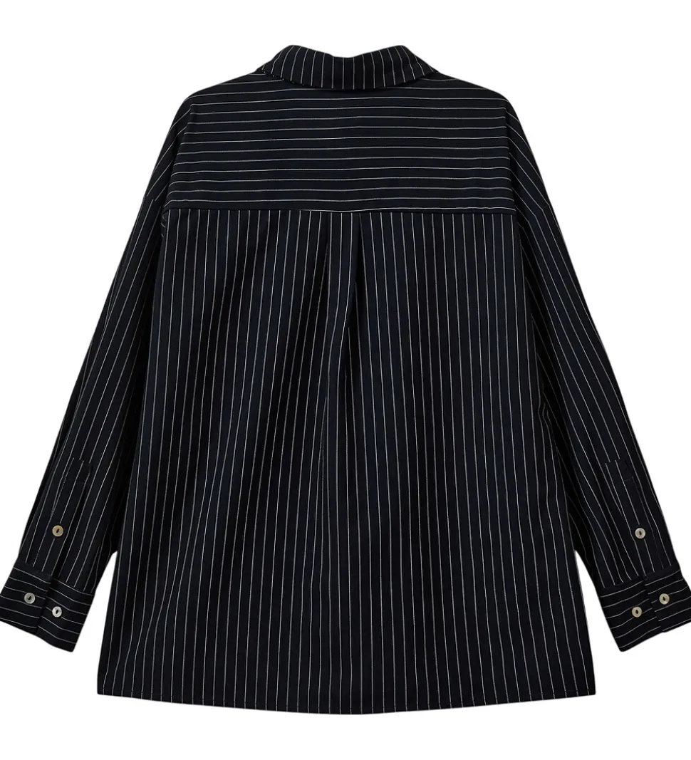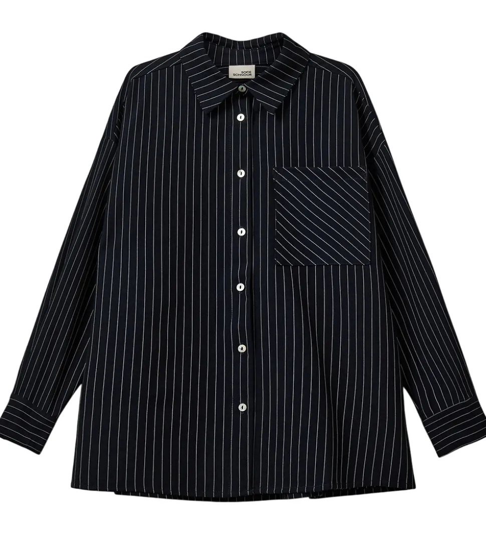 Stilfuld Sofie Schnoor skjorte med lange ærmer og en klassisk krave. Skjorten har et tidløst design med smalle hvide striber på en navy baggrund. Den er udstyret med en enkelt brystlomme, der tilføjer en ekstra detalje til det enkle udtryk. Skjorten har en løs pasform, hvilket ses i den afslappede silhuet.