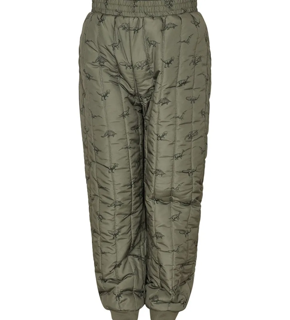 Fine Petit by Sofie Schnoor termobukser i armygrøn med et alloverdinosaurprint med en quiltet struktur.