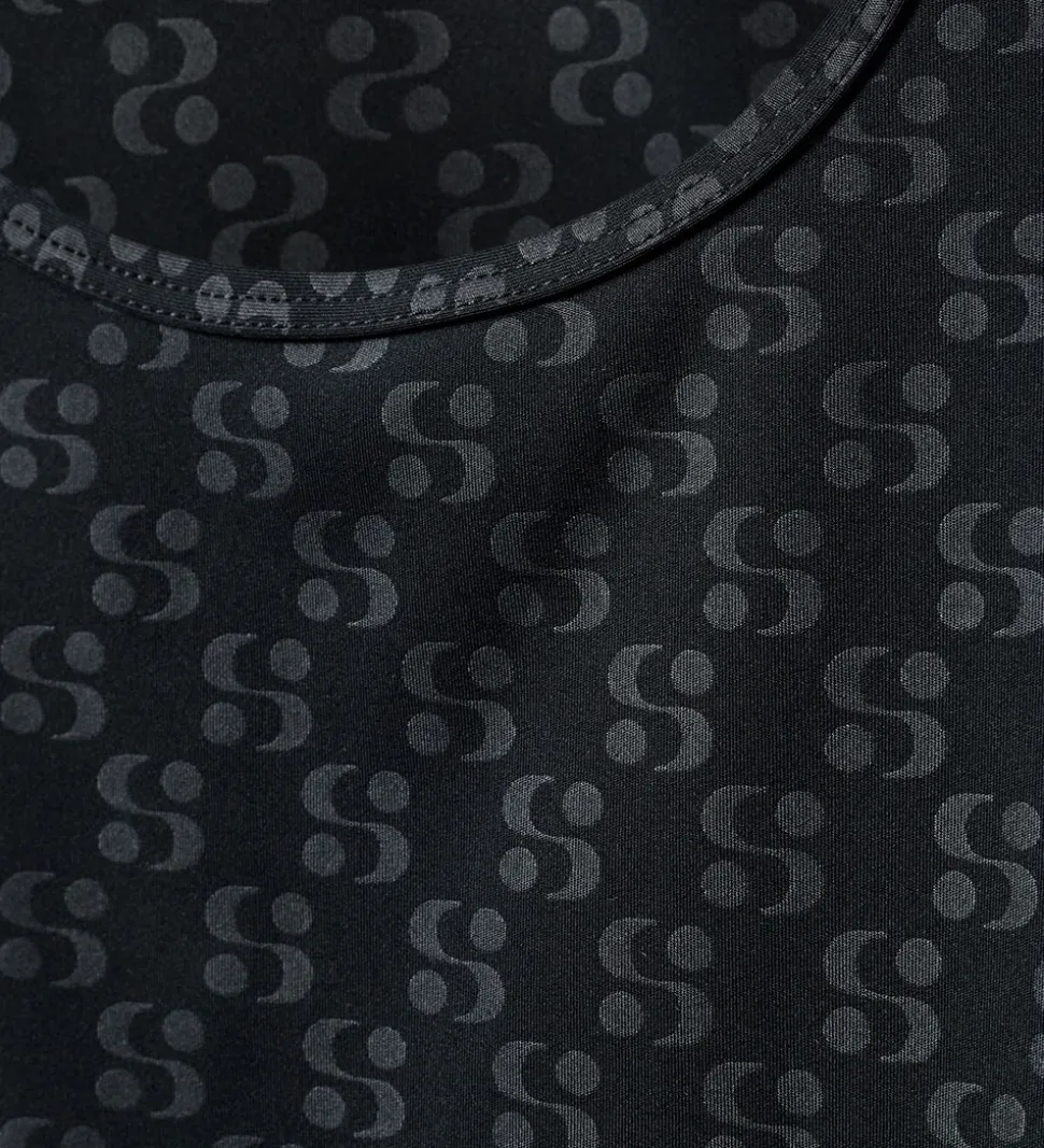Elegant Sofie Schnoor top i sort med et diskret alloverprint af bogstavet “S”. Sofie Schnoor toppen har en rund halsudskæring og brede skulderstropper. Toppen har en tætsiddende pasform, og egner sig godt til sport og fysisk aktivitet.