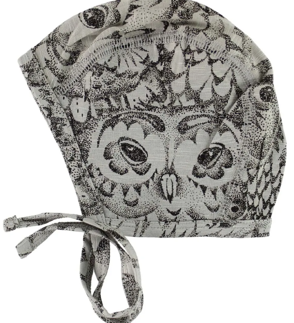 Lækker Soft Gallery babyhjelm i grå med et sort print af ugler.