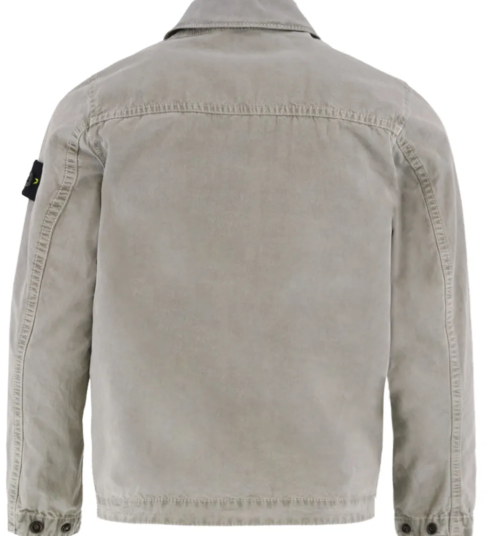 Smart Stone Island jakke i ensfarvet grå i en let, fastvævet bomuldskvalitet og med en sort lynlås. Øverst på venstre ærme sidder det ikoniske logomærke fast med knapper.