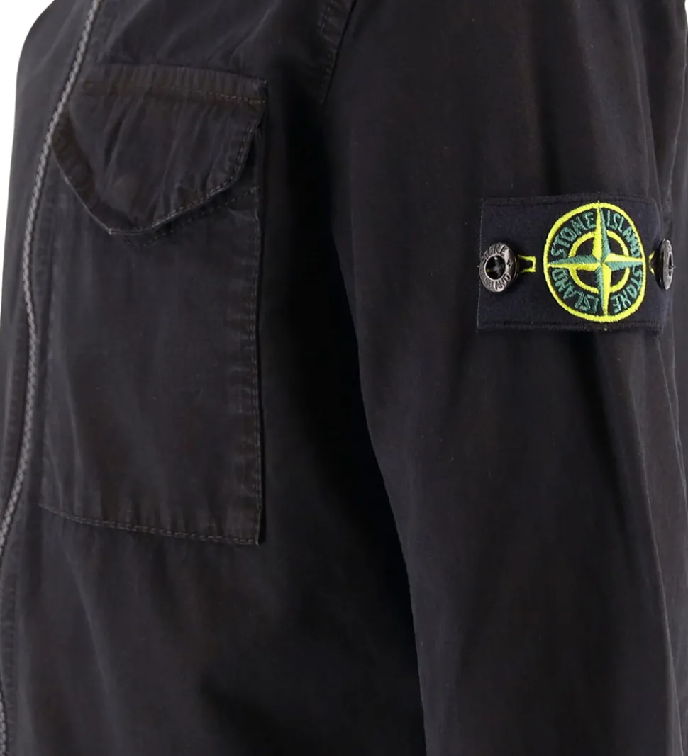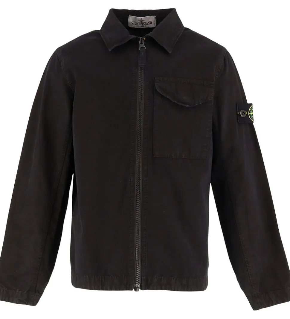 Lækker Stone Island jakke i ensfarvet sort i en let, fastvævet bomuldskvalitet og med en sort lynlås. Øverst på venstre ærme sidder det ikoniske logomærke fast med knapper.