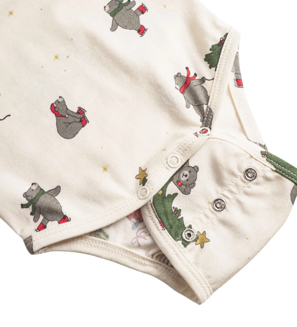 Charmerende Thats Mine body med lange ærmer, dekoreret med et detaljeret jule mønster på en cremefarvet baggrund. Bodyen fra Thats Mine har en blød rund halsudskæring og er smukt afsluttet med kanter ved ærmerne. Den praktiske knaplukning på venstre skulder samt i bunden sikrer nem af- og påtagning. I bunden er der to justeringsmuligheder med trykknapper.