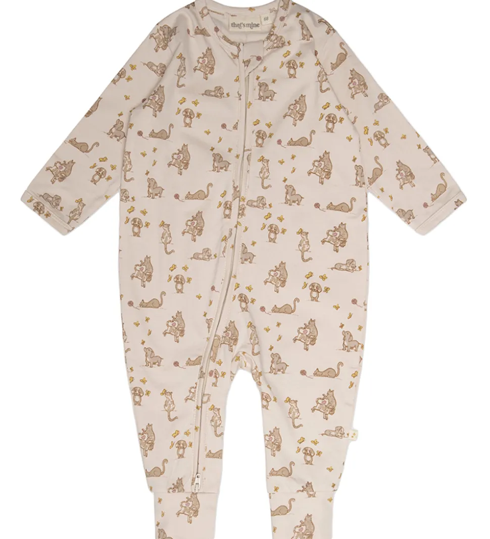 Pæn That’s Mine heldragt i rosa med et alloverprint af hundehvalpe og kattekillinger i rosa og beige farver.