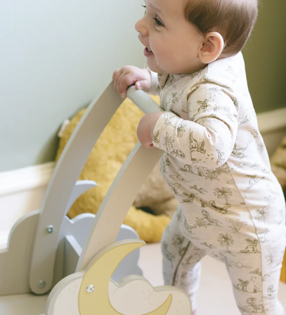 Smart That’s Mine heldragt i cremehvid med et opstreget, mørkegrønt alloverprint af musikglade dinoer.