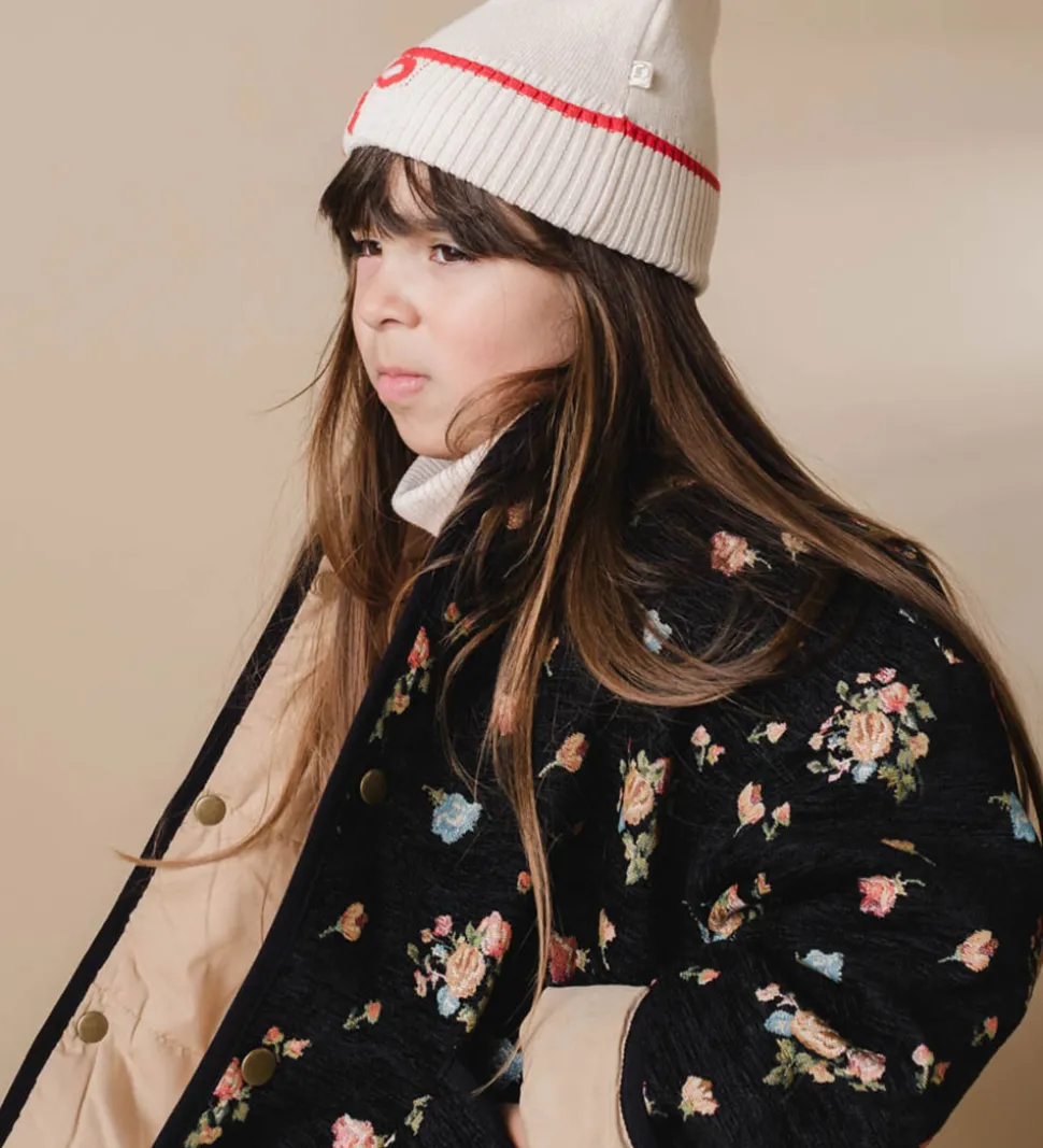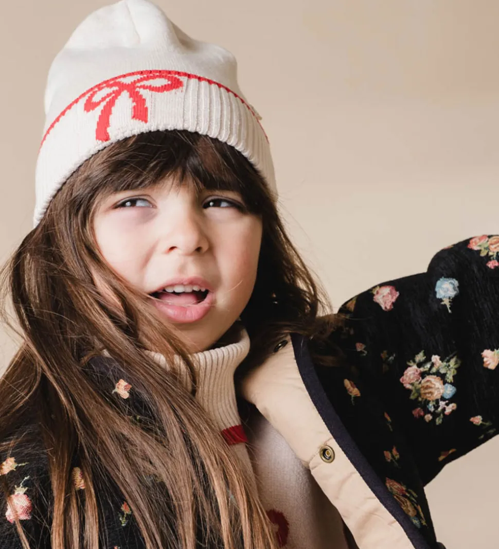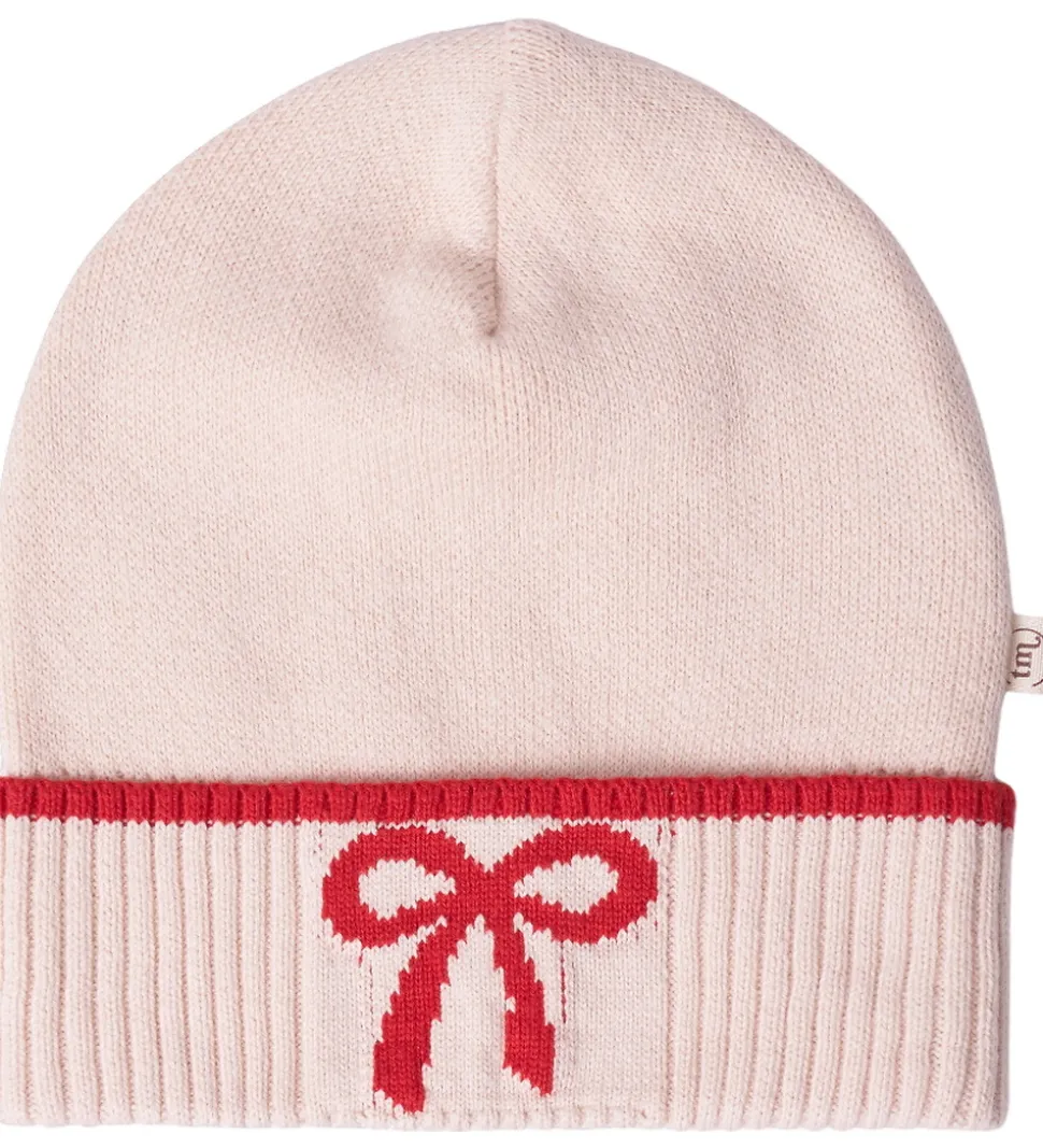 Charmerende Thats Mine hue i en blød, lyserosa farve. Huen har en strikket struktur og er udsmykket med en elegant, rød sløjfe på kanten, som skaber en fin kontrast. Huen fra Thats Mine kombinerer enkelt design med funktionalitet.