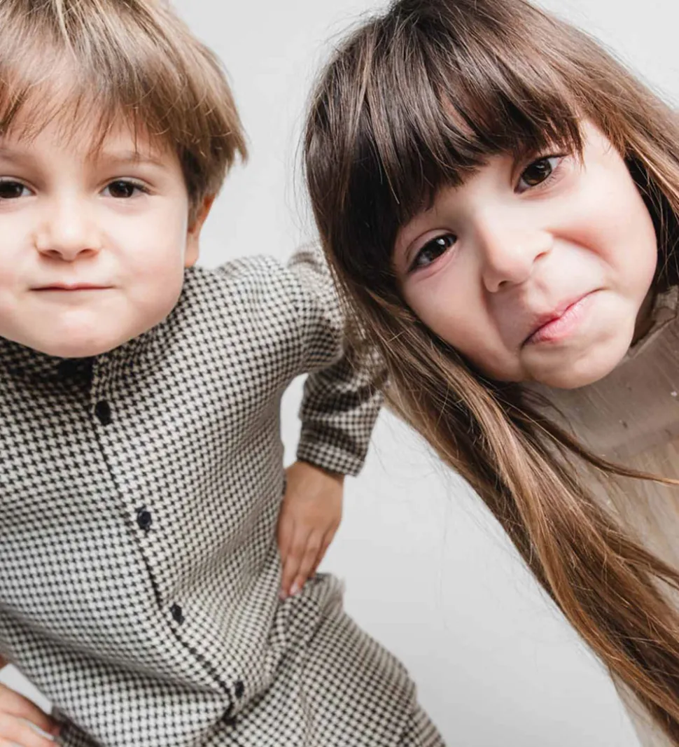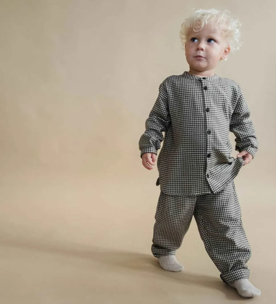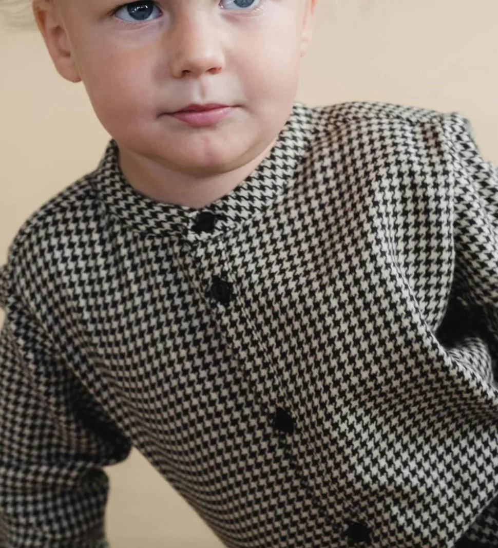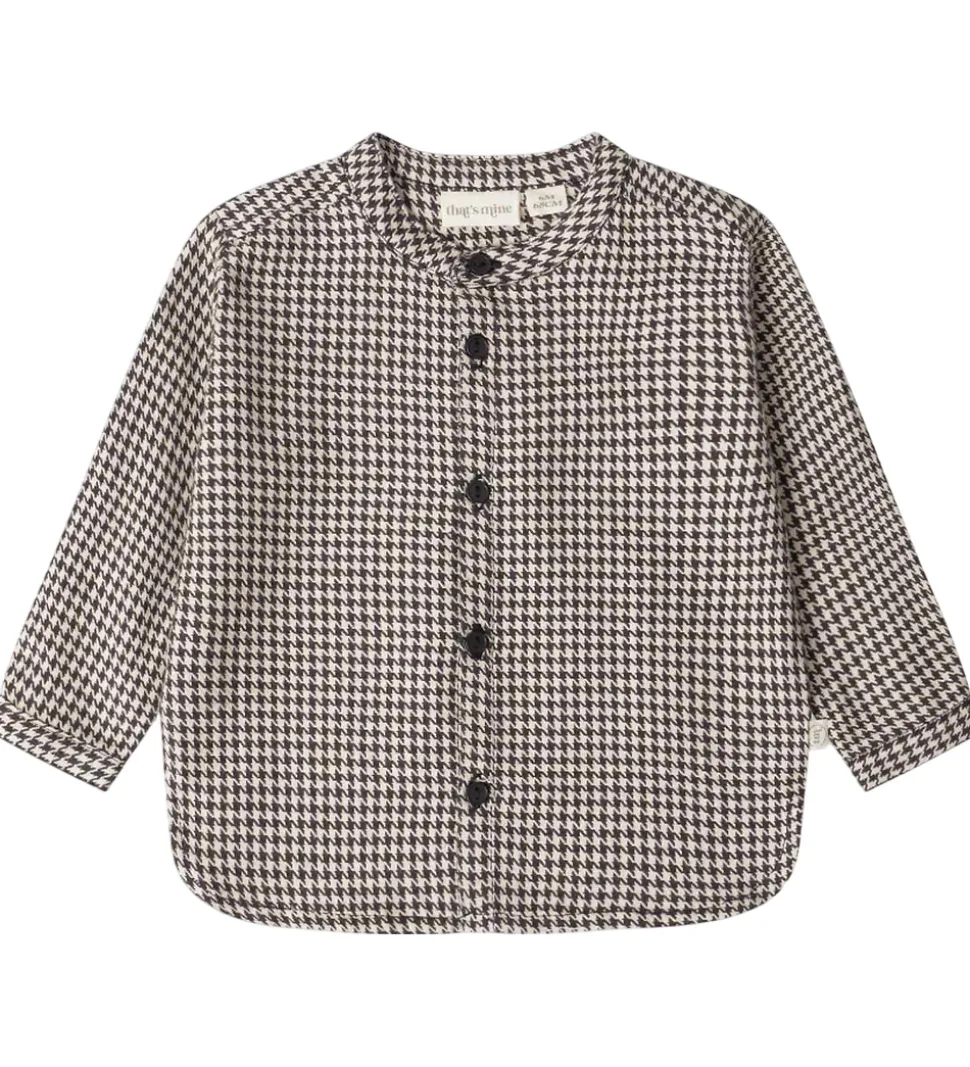 Stilfuld skjorte fra Thats Mine med et klassisk hundetandsmønster i sort og hvid. Skjorten har lange ærmer, en rund halsudskæring og lukkes med sorte knapper ned foran.