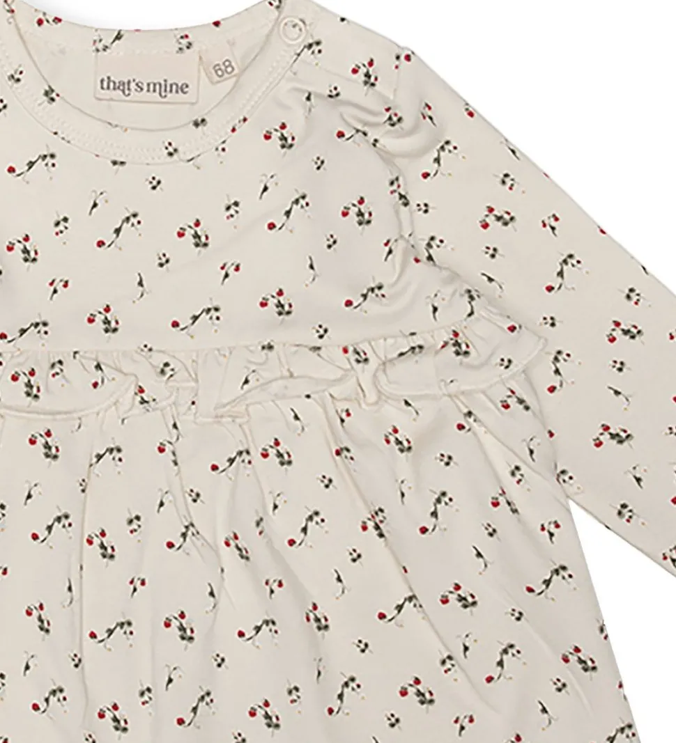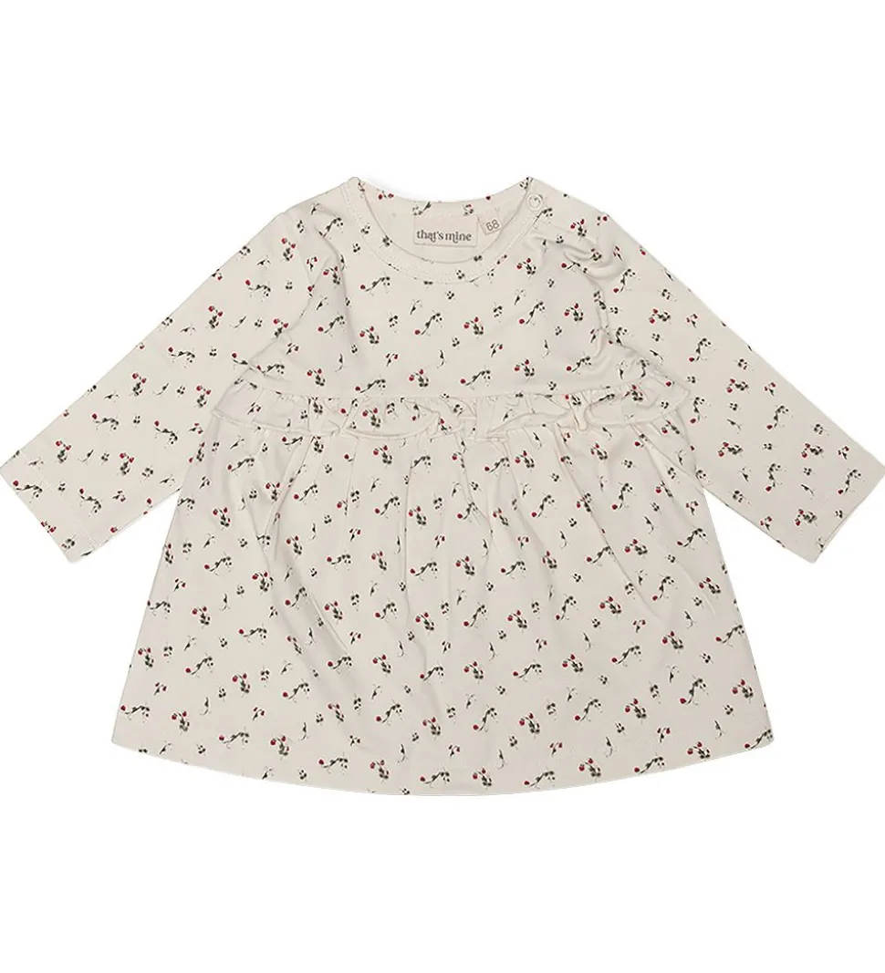 That’s Mine tunikaen har en rund hals med en smal ribkant, der åbnes med trykknapper i venstre skulder. Tunikaen er med lange ærmer. Omkring taljen har den en elastisk flæsekant, som også laver fine folder i skørtet. Tunikaen er i en lækker og strækbar blanding af bomuld og modal.