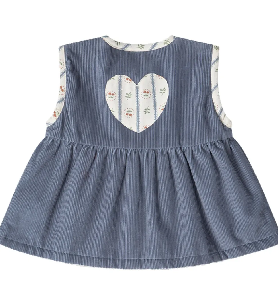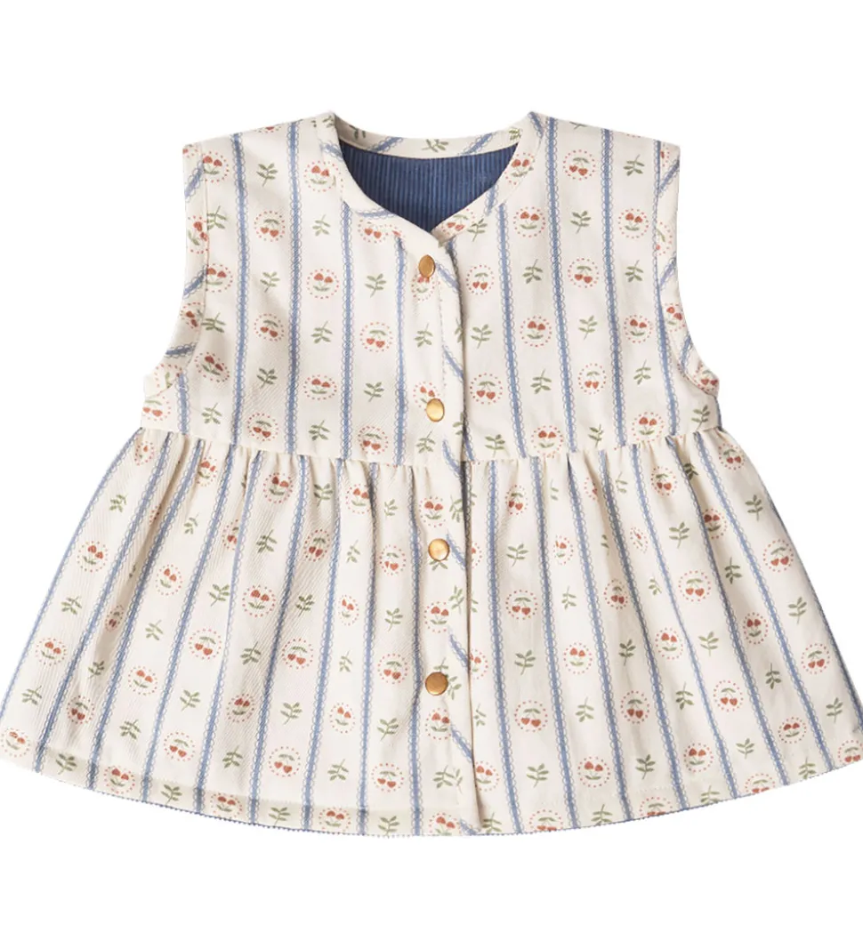 Flot Thats Mine vest med et vendbart design. På den ene side er den ensfarvet gråblå med fløjlstruktur, mens den på den anden side er hvid med et print af kirsebær og blade i grønne og røde nuancer. Vesten har en let V-udskæring og lukkes nemt med trykknapper.