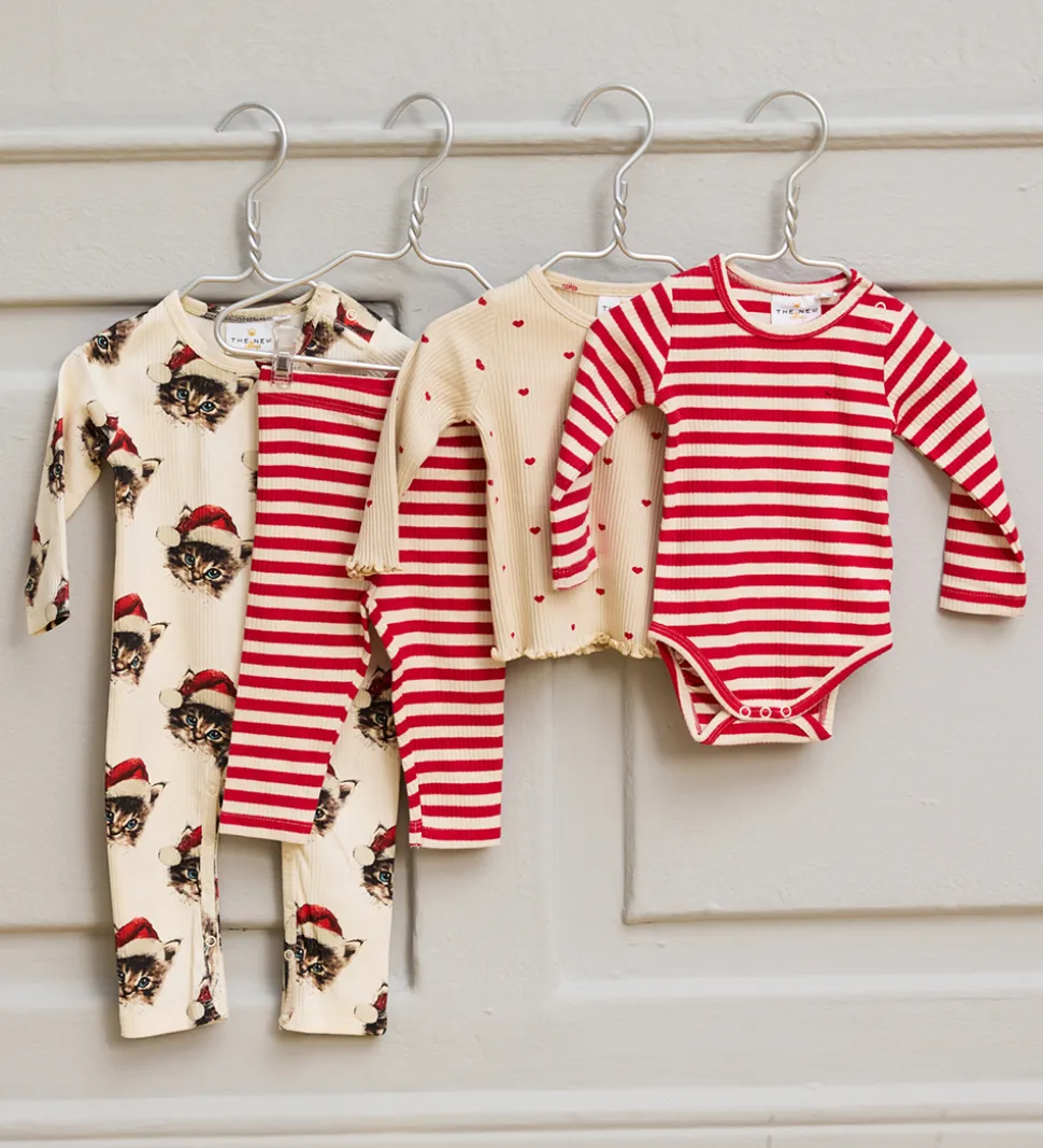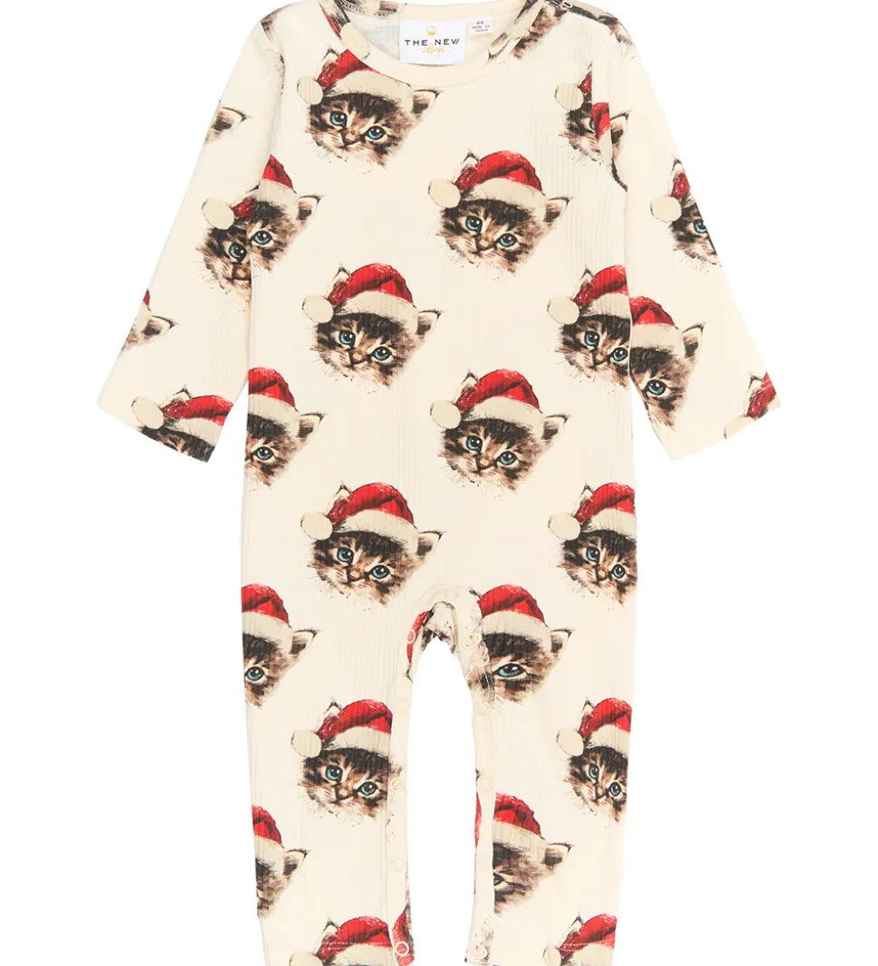 Charmerende The New Siblings heldragt i en cremet farve med et yndigt print af katte iført julehuer, samt med en lækker ribstruktur.