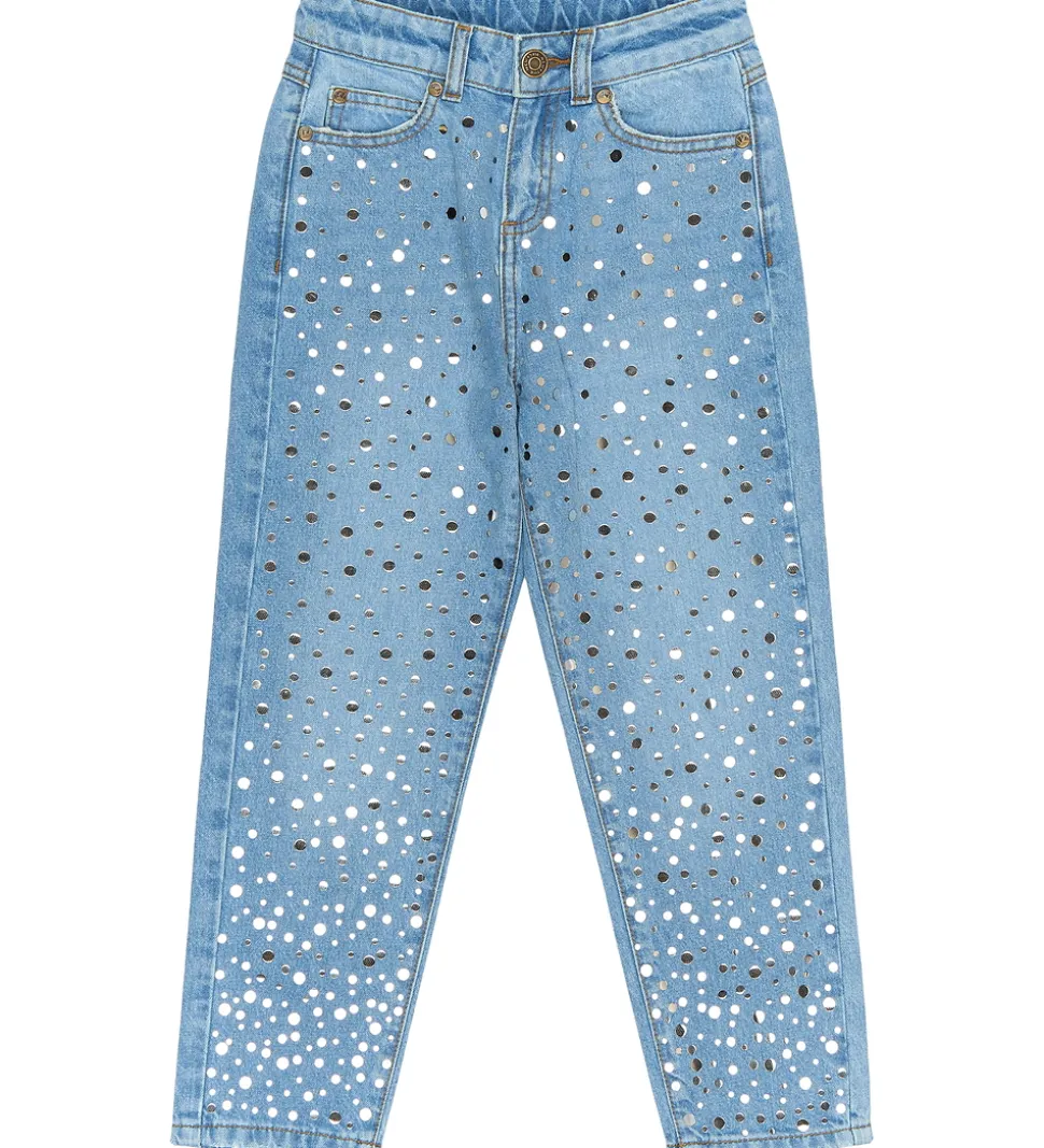 Flotte The New jeans i lyseblå denim med runde palietter i sølv foran. The New jeansene har en elastisk talje, som kan justeres med knapper indvendigt. De lukkes fortil med en hægte og lynlås. Jeansene har bæltestropper og lommer på for- og bagside. De har en klassisk pasform.