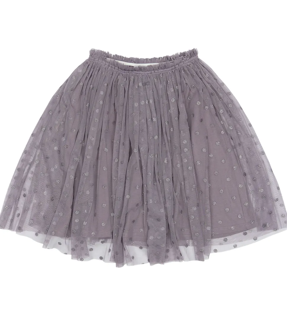 Yndig nederdel fra The New i støvet lilla tyl og med små sølvglimmer smileys over det hele. The New nederdelen har en elastisk talje, som sikrer en god pasform og har desuden et blødt og glatvævet underskørt, så den ikke fremstår gennemsigtig.