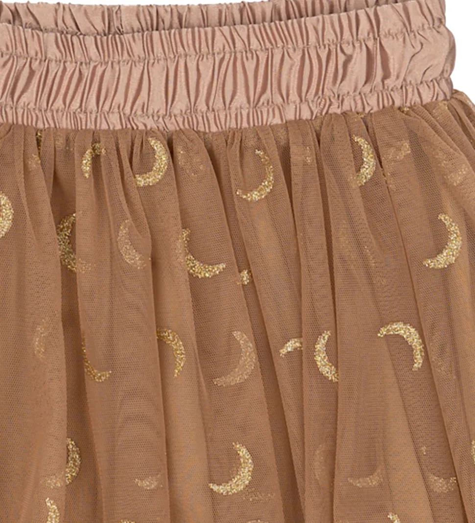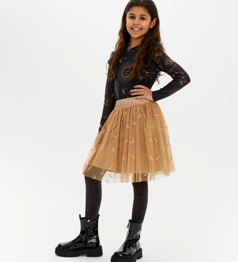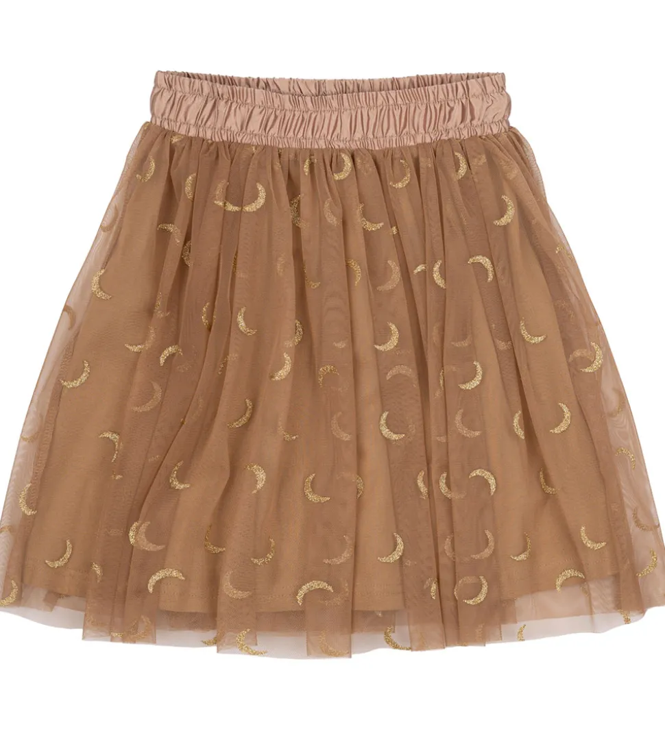 Elegant The New nederdel i en skøn gyldenbrun nuance og med et allover halvmåne print i guldglitter. The New nederdelen har en smocksyet elastikkant i taljen, som kan reguleres med knapper indvendigt og er med et glatvævet og strækbart underskørt, som føles behagelig mod huden.