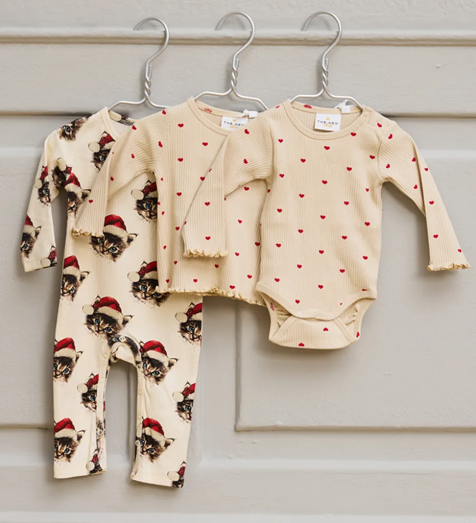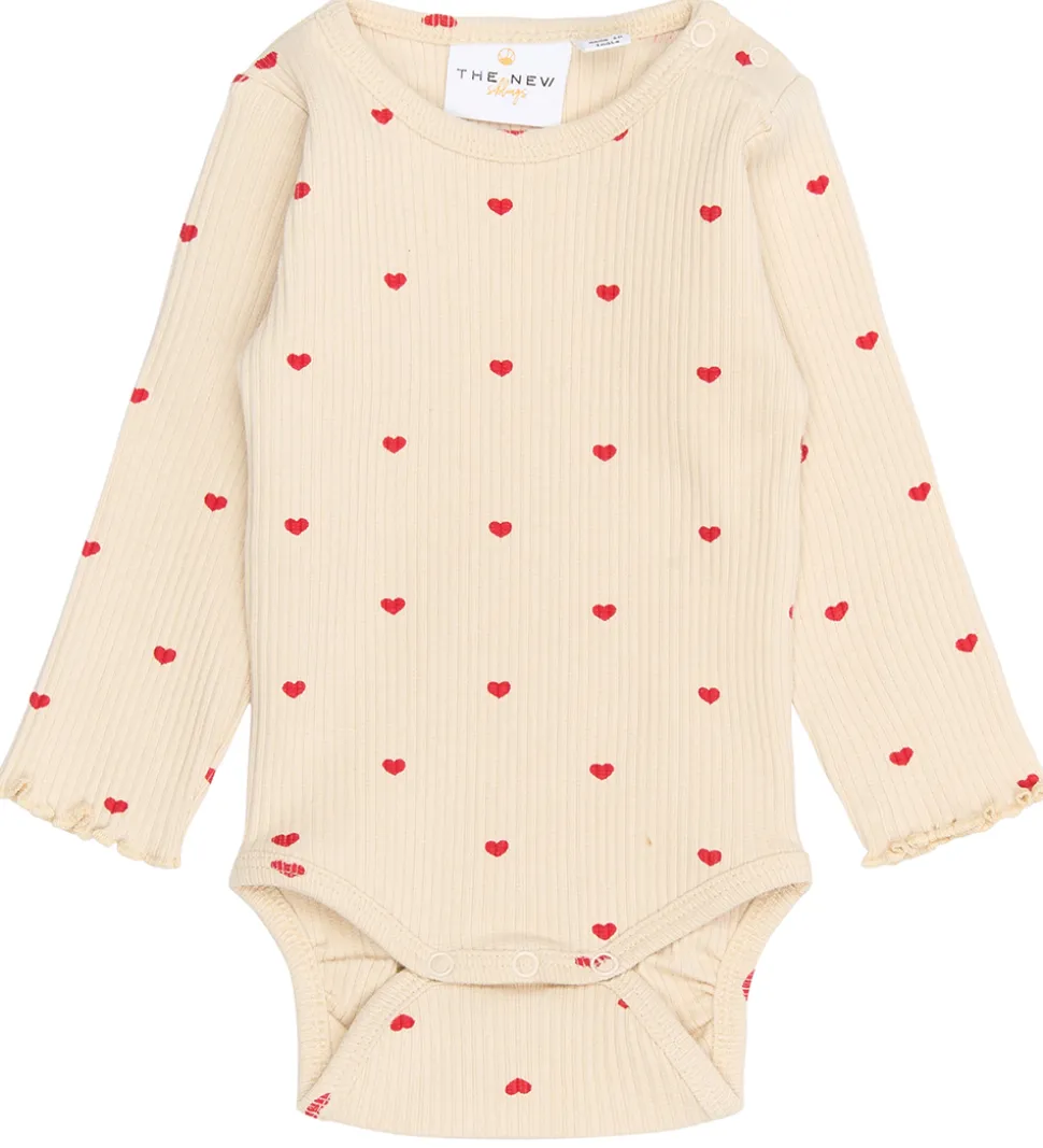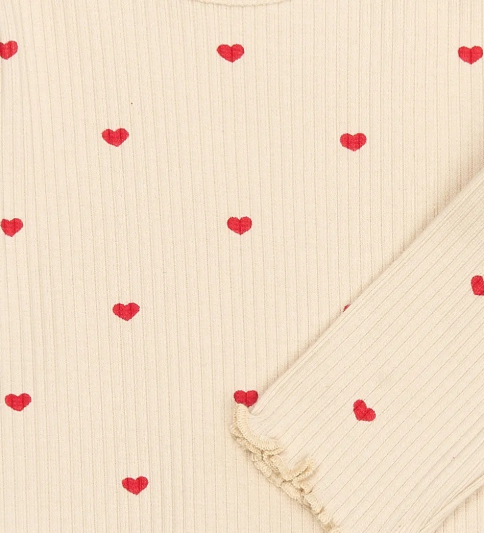 Charmerende The New Siblings body med lange ærmer i en lys cremefarve prydet med små, røde hjerteprint. Det fine ribmønster giver en flot struktur til bodyen. The New har designet den med elastiske kanter ved ærmerne, som afsluttes med en lille flæsedetalje.