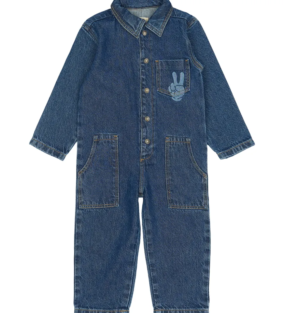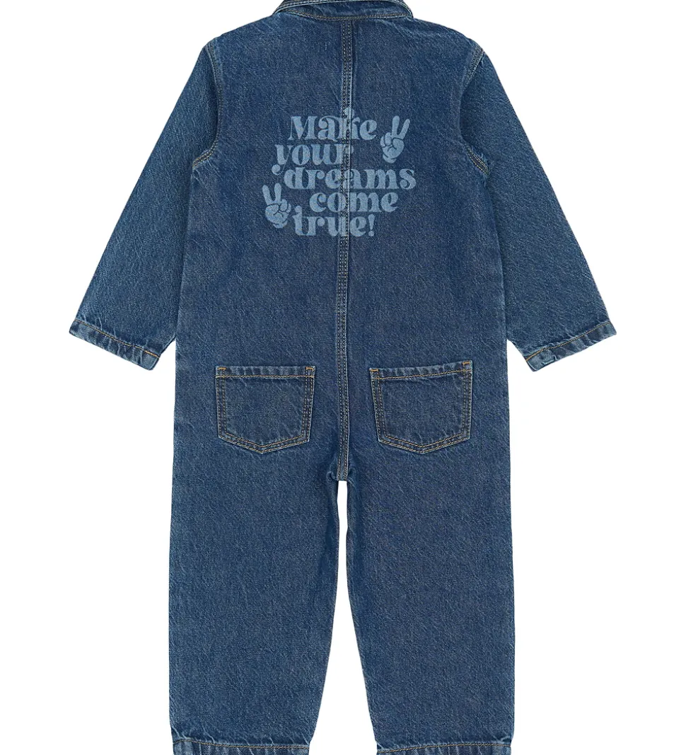 Smart The New Siblings buksedragt i mellemblå denim med detaljer i en lysere blå tone, bl.a. et “peace” håndtegn på den åbne brystlomme. På ryggen er samme håndtegn sammen med teksten “Make your dreams come true!”. The New Siblings buksedragten har lange ærmer og ben samt en klassisk ombukket krave. Den er forsynet med praktiske trykknapper langs fronten og har to store lommer på forsiden samt åbne baglommer.