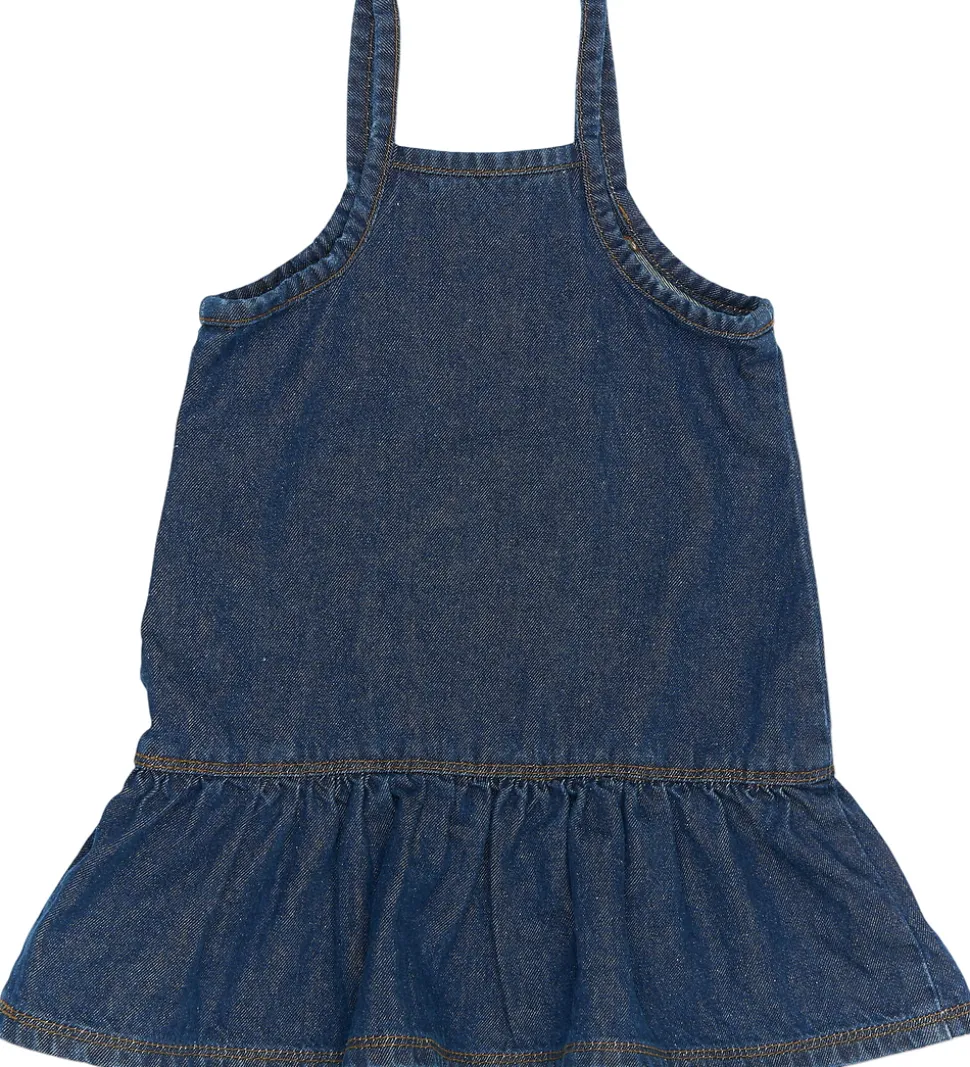 Smart The New Siblings kjole i mørkeblå denim med en broderet sløjfe på brystet i guld. Kjolen har tynde stropper, og den er skåret ved livet, hvor skørtet får fin vidde.