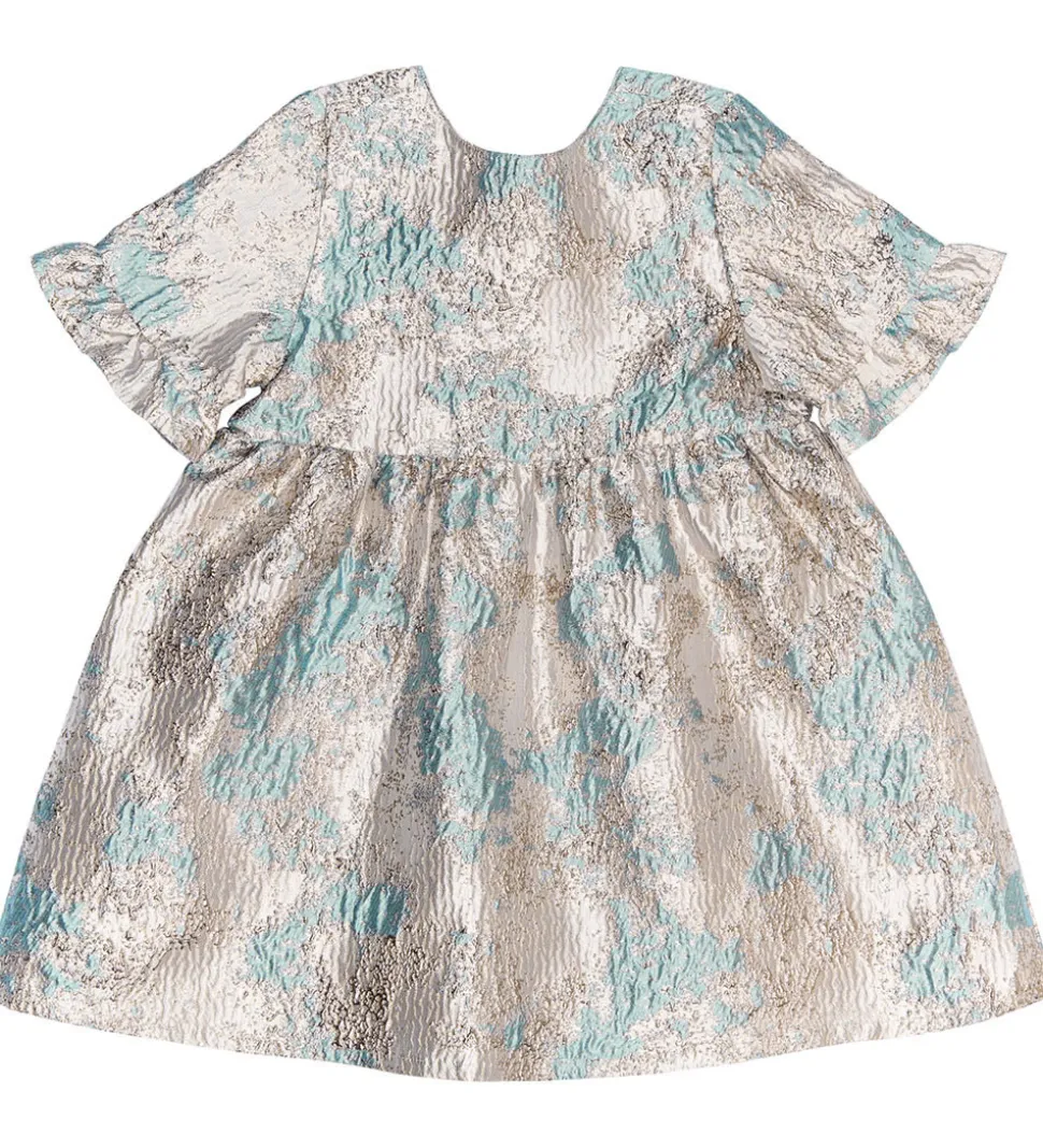 Elegant kjole fra The New Siblings i lyseblå og en skinnende, metallisk nuance. The New Siblings kjolen har korte ærmer med delikate flæser, samt en nedringet ryg.
