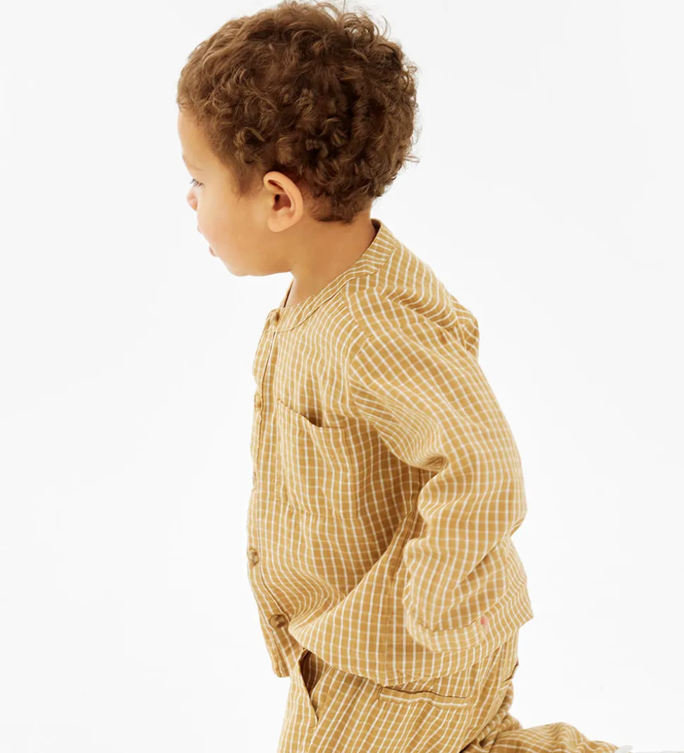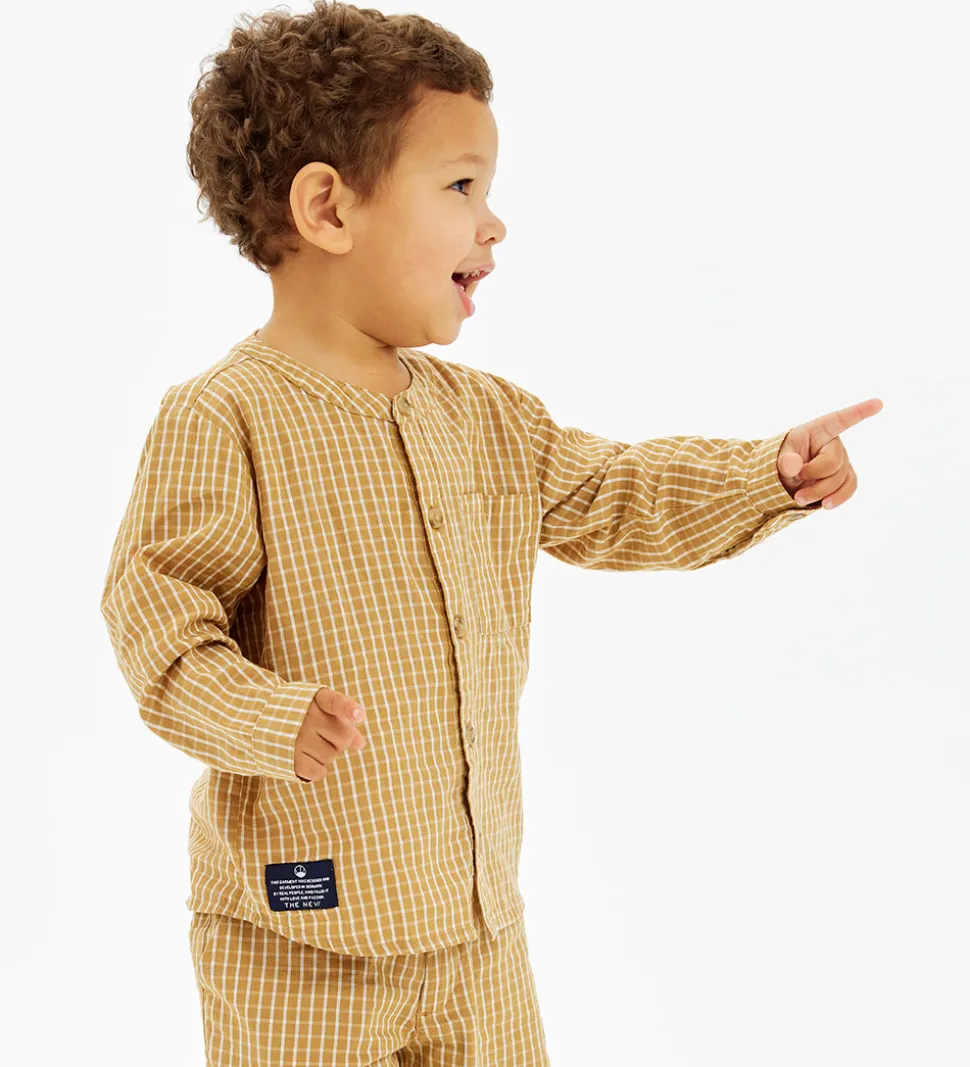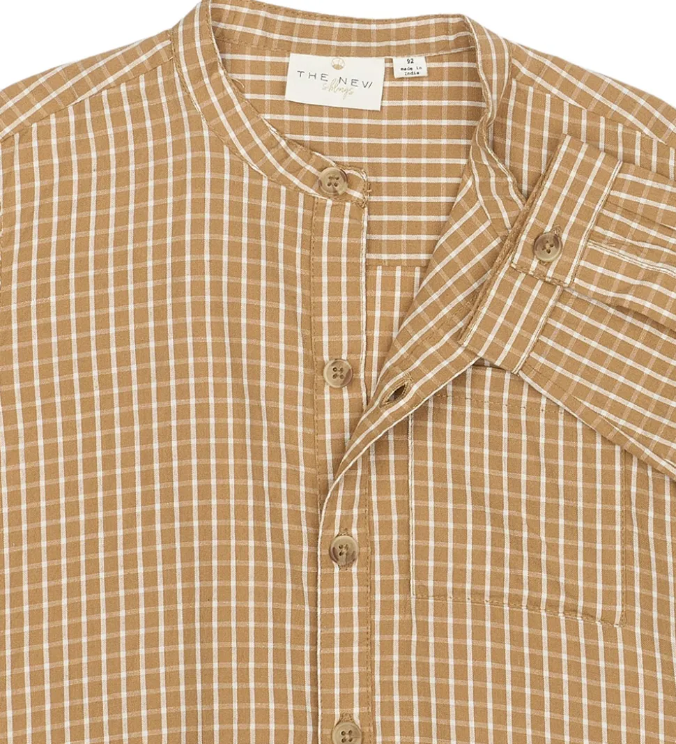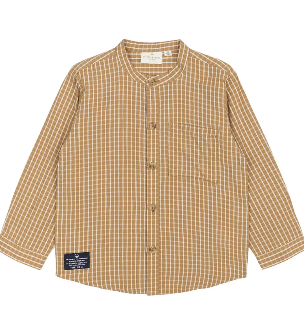 Lækker The New Siblings skjorte i en varm, gyldenbrun nuance med et klassisk ternet mønster. Skjorten har lange ærmer og en flot kinakrave, og fortil har den en brystlomme.