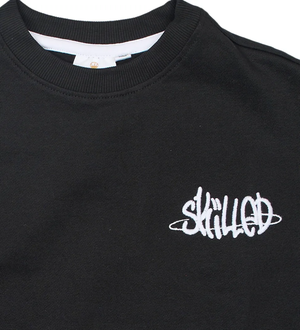 Stilfuld The New sweatshirt i en klassisk, sort farve med et hvidt print af ordet “Skilled” på brystet og ryggen. The New sweatshirten er designet med lange ærmer, rund hals og brede ribkanter, hvilket giver et tidløst og enkelt udtryk.