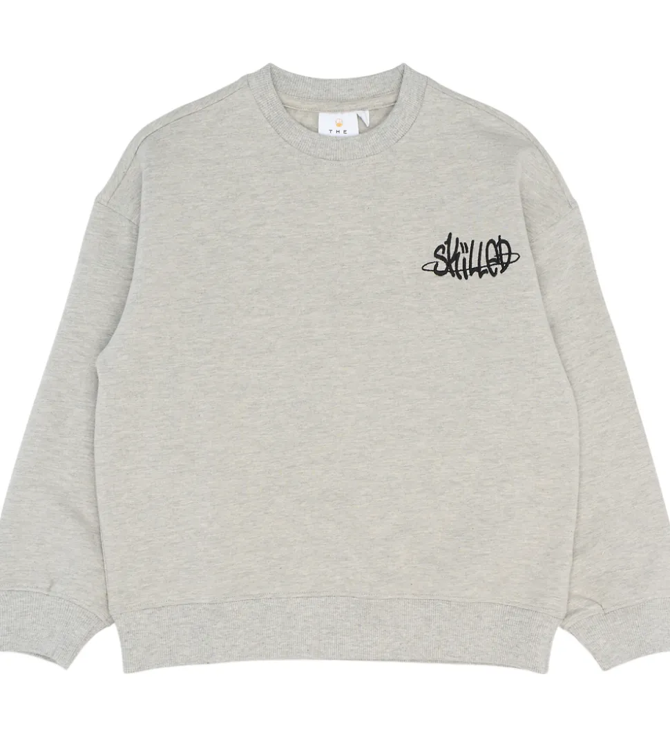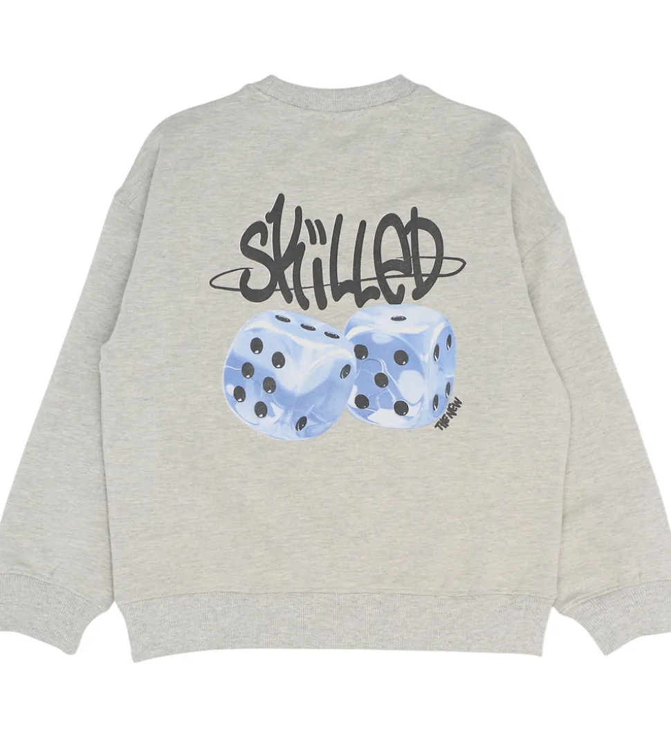 Stilfuld The New sweatshirt i en meleret, lysegrå nuance og med et unikt, sort print på brystet, samt med et stort terninge-print på ryggen.