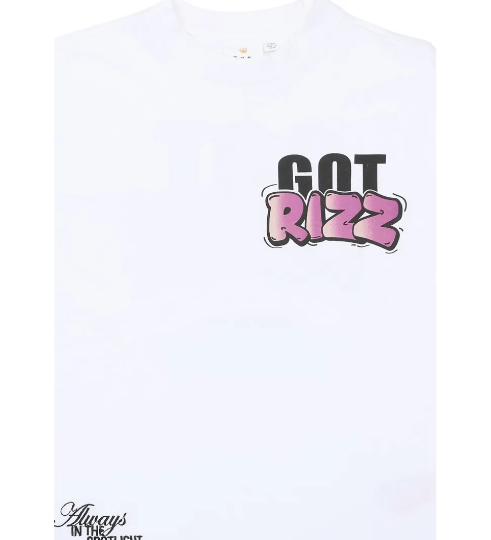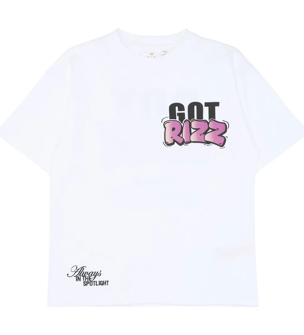 Stilren The New t-shirt i hvid. T-shirten har et iøjnefaldende, grafisk tryk med teksten “Got Rizz” i sort og pink på forsiden og bagsiden, som giver et moderne udtryk. The New t-shirten har en klassisk rund halsudskæring.