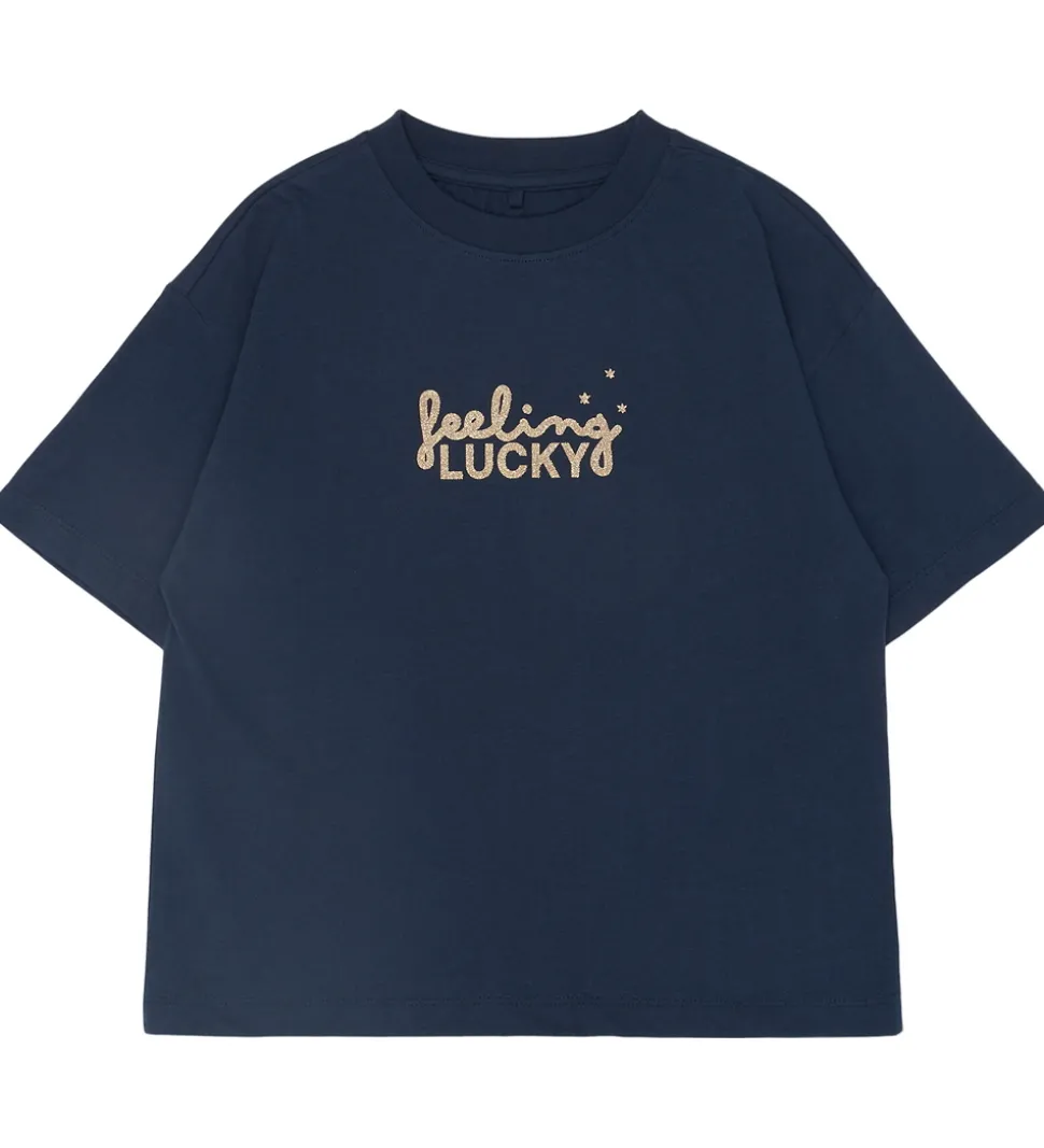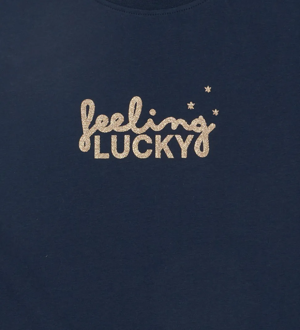 T-shirten er prydet med et smukt motiv på brystet og ryggen med teksten “feeling LUCKY” og små stjernedetaljer, der tilføjer en ekstra dimension. The New t-shirten har en rund halsudskæring med ribkant, der giver et klassisk look.