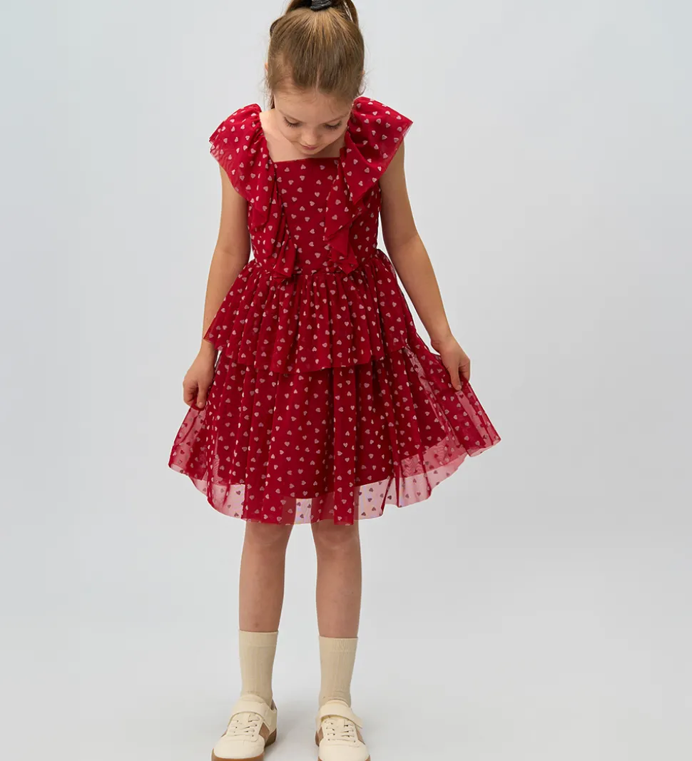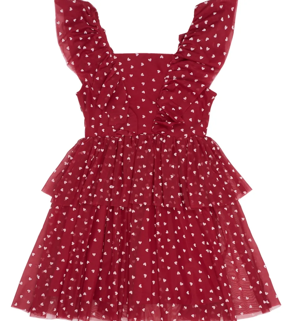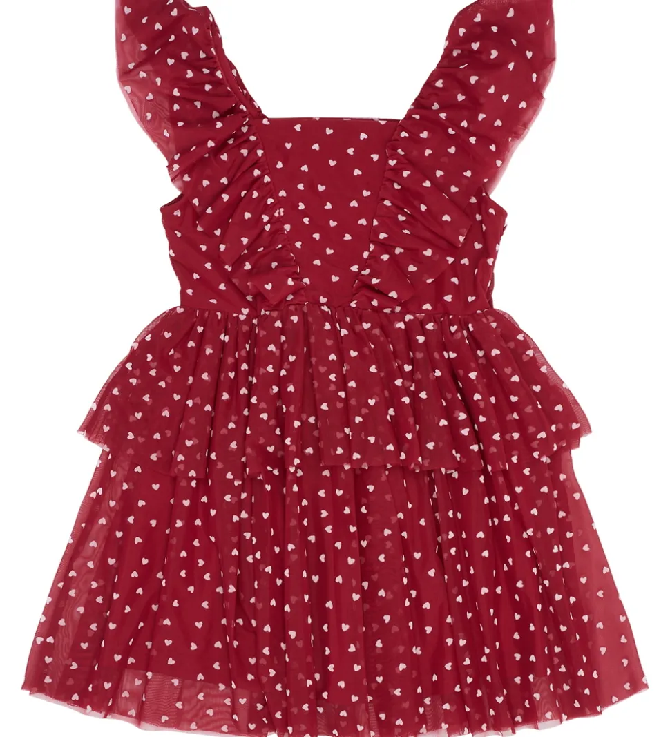 Elegant The New tylkjole i en dyb, rød nuance med hjerteprint i rosa. The New tylkjolen har voluminøse flæseærmer og et skørt med flere lag tyl, der giver et let og luftigt look.