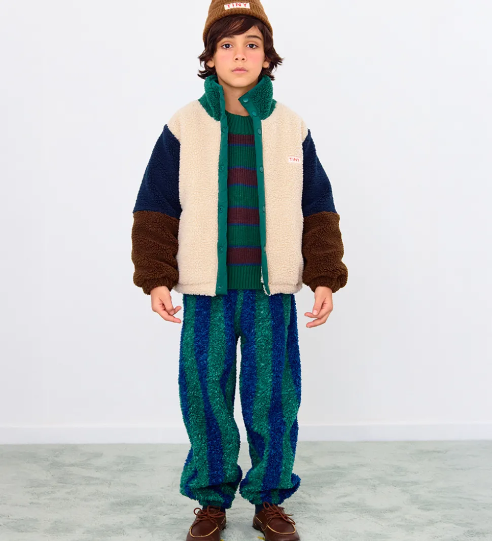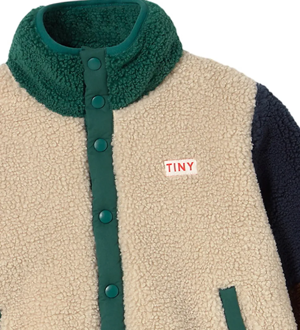 Indbydende fleecejakke fra Tiny Cottons af blødt teddyfleece, og i en flot farvekombination i beige, grøn, mørkeblå og brun. Den har en mellemhøj hals og lange ærmer med elastikkanter, der giver et stilfuldt udtryk.