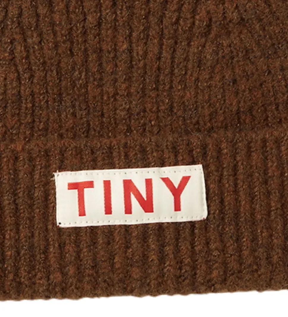 Behagelig hue fra Tiny Cottons i en varm brun nuance i en strikket kvalitet med en flot ribstruktur. Foran prydes huen af et tydeligt mærkelogo i rød kontrast på en hvid baggrund, hvilket giver et genkendeligt udtryk. Huen fra Tiny Cottons kombinerer enkelhed og funktionalitet på en elegant måde.