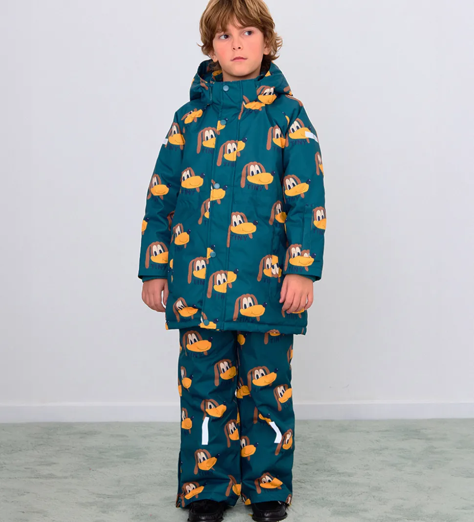 Flot Tiny Cottons vinterjakke i en petroleumsgrøn nuance med et charmerende hundeprint i gule og brune nuancer.