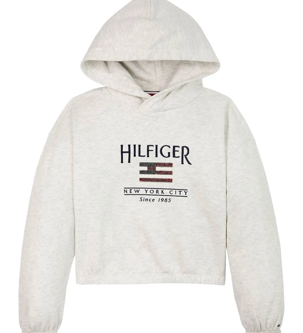 Smart Tommy Hilfiger hættetrøje i en meleret lysegråt sweat, og fortil er der et logo lavet af pailletter. Hættetrøjen har lange ærmer og brede elastikkanter, og den har et kort, cropped snit.