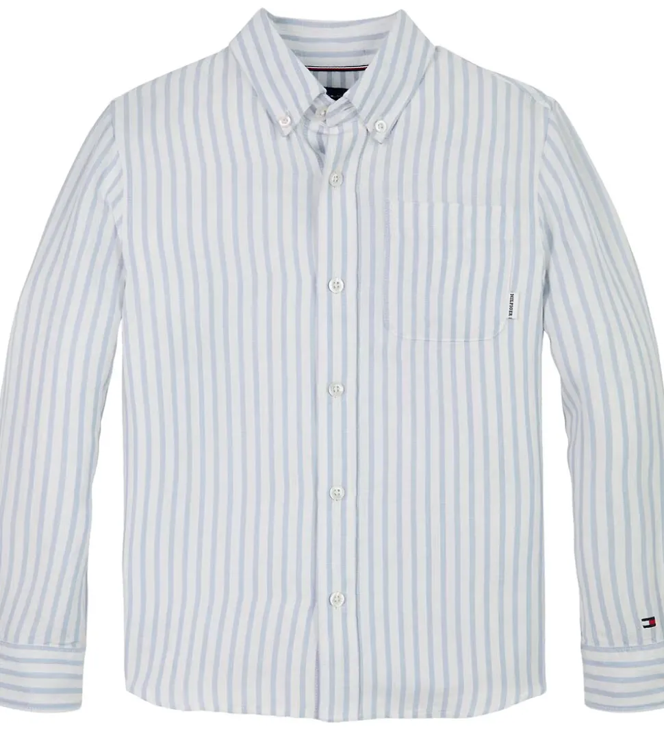 Klassisk Tommy Hilfiger skjorte med lange ærmer i en elegant lyseblå med hvide striber. Skjorten har en praktisk brystlomme og en diskret knaplukning. Tommy Hilfiger-logoet er smukt placeret ved ærmet.