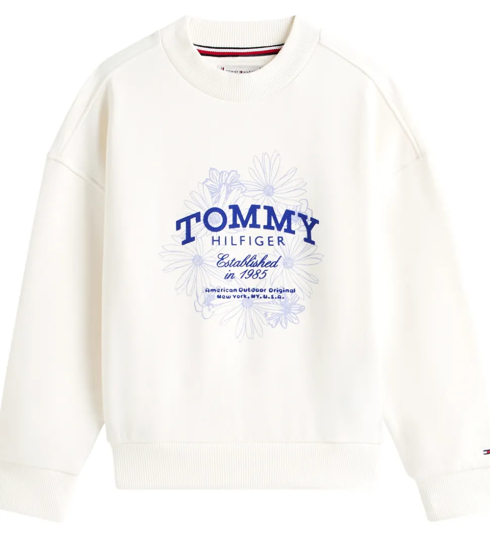 Elegant Tommy Hilfiger sweatshirt i hvid med et print på fronten af blå blomster og et stort logo. Sweatshirten har en rund halsudskæring og lange ærmer med brede ribkanter ved alle åbninger.