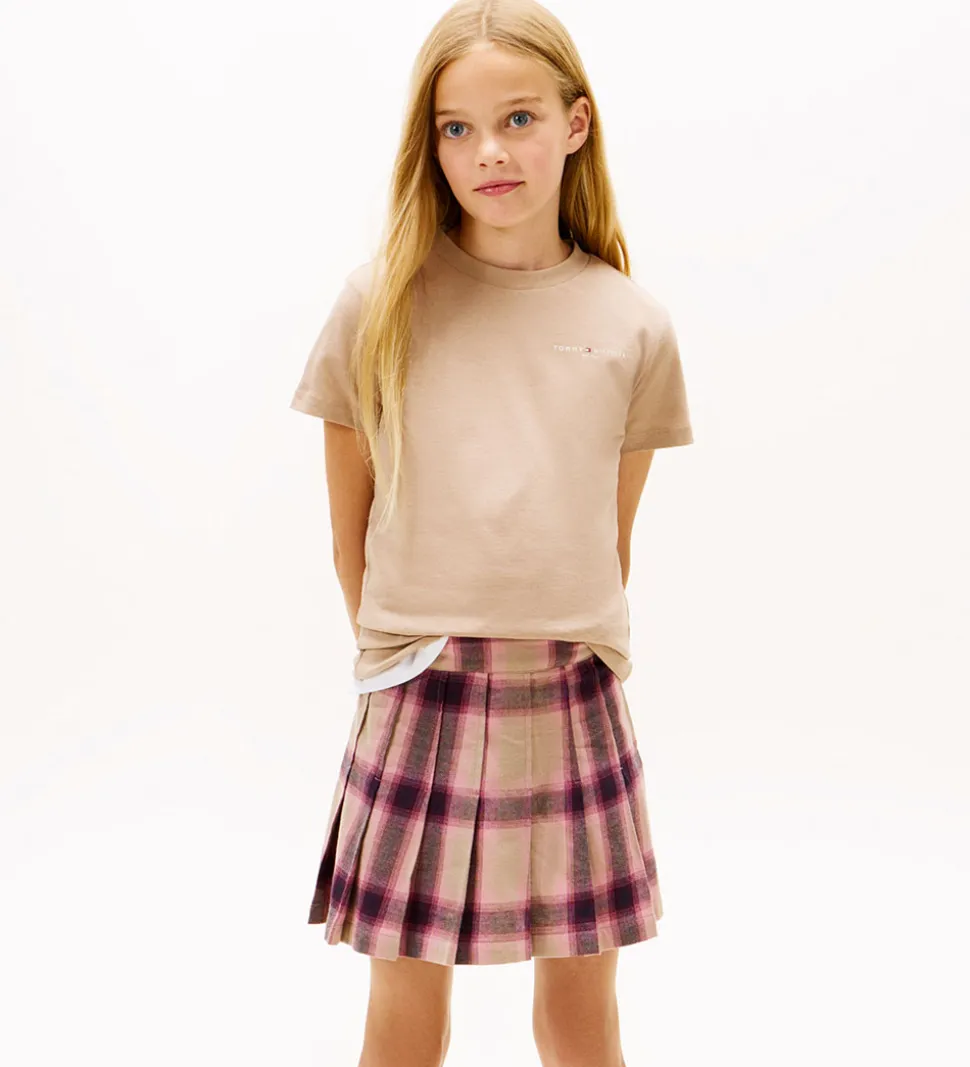 Elegant Tommy Hilfiger t-shirt i en klassisk beige nuance. T-shirten har brandets navn diskret trykt på brystet og et lille logo på det ene ærme. Tommy Hilfiger t-shirten er designet med en rund halsudskæring, der har en smal ribkant for et stilrent udseende.