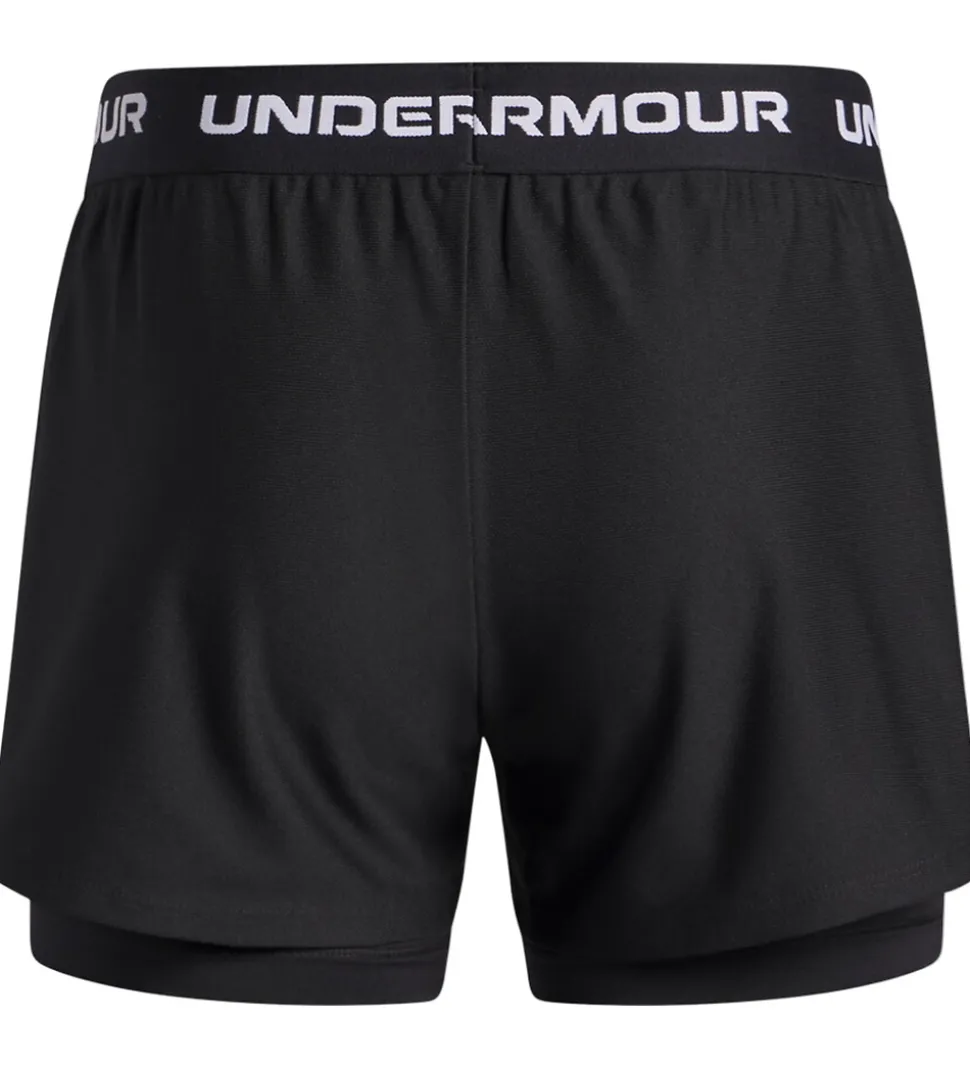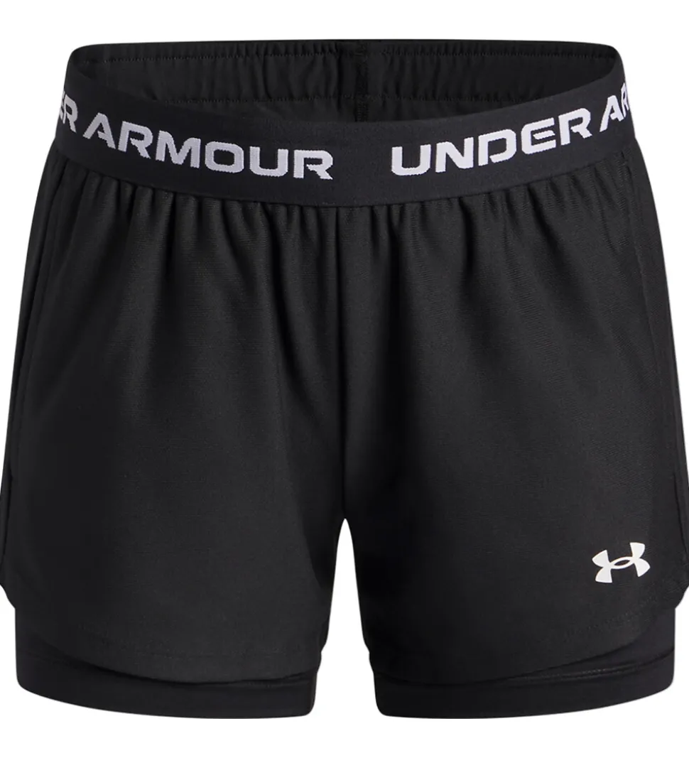 Seje Under Armour sportsshorts i sort, og hele vejen rundt i livet står der “Under Armour” i hvid.