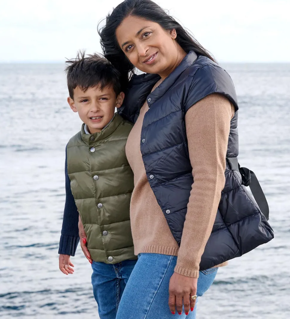 Smart Ver de Terre dunvest i ensfarvet armygrøn. Vesten er lavet i et glatvævet materiale med vandrette syninger, der giver et klassisk dunjakke look.