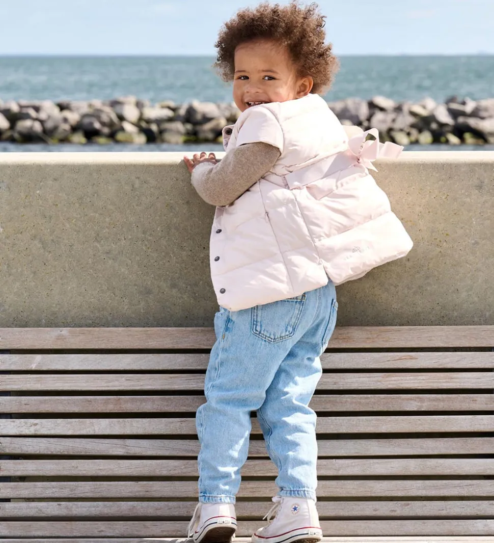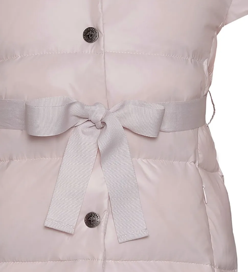 Sød Ver de Terre dunvest i pudderrosa og med et pudderrosa bælte i livet. Dunvesten er lavet i et glatvævet materiale med vandrette syninger, der giver et klassisk dunjakke look.