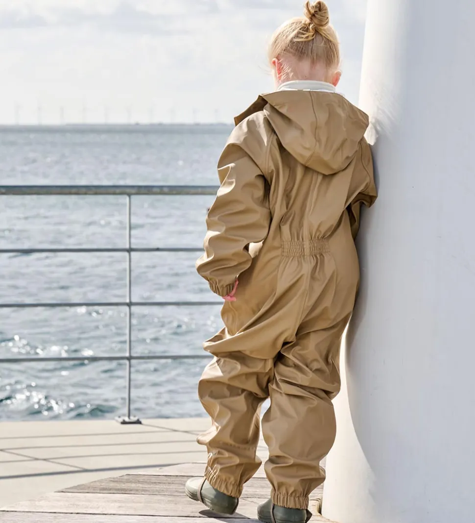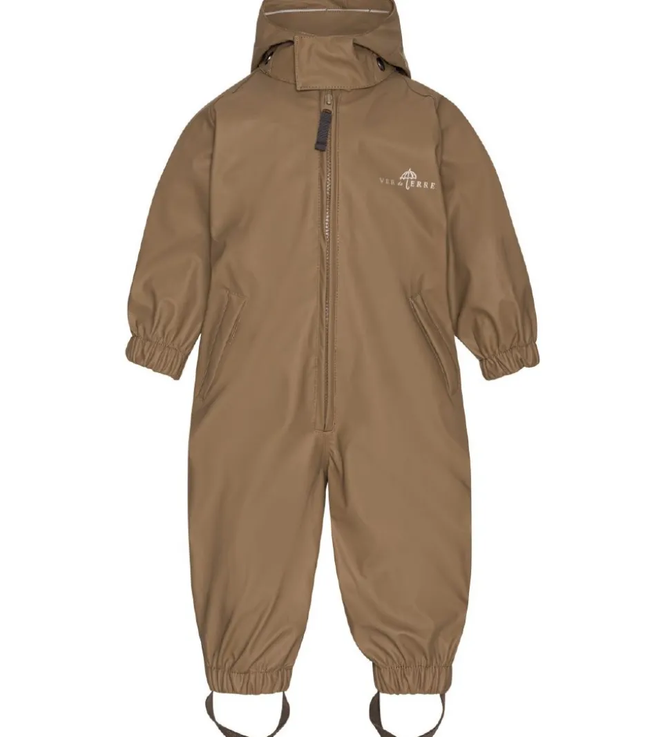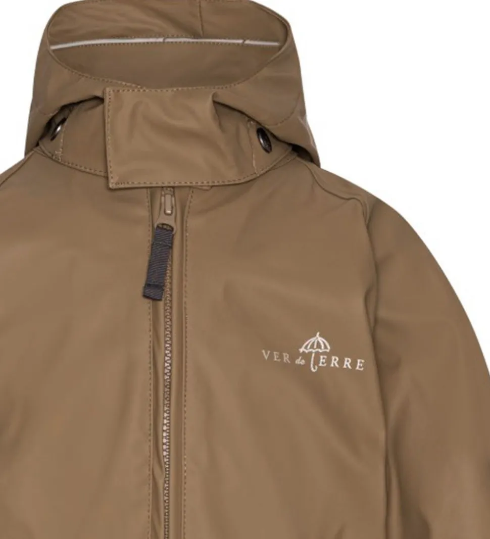Fin Ver de Terre regndragt i ensfarvet brun PU med et refleksprint af “Ver de Terre” på venstre bryst og ben.