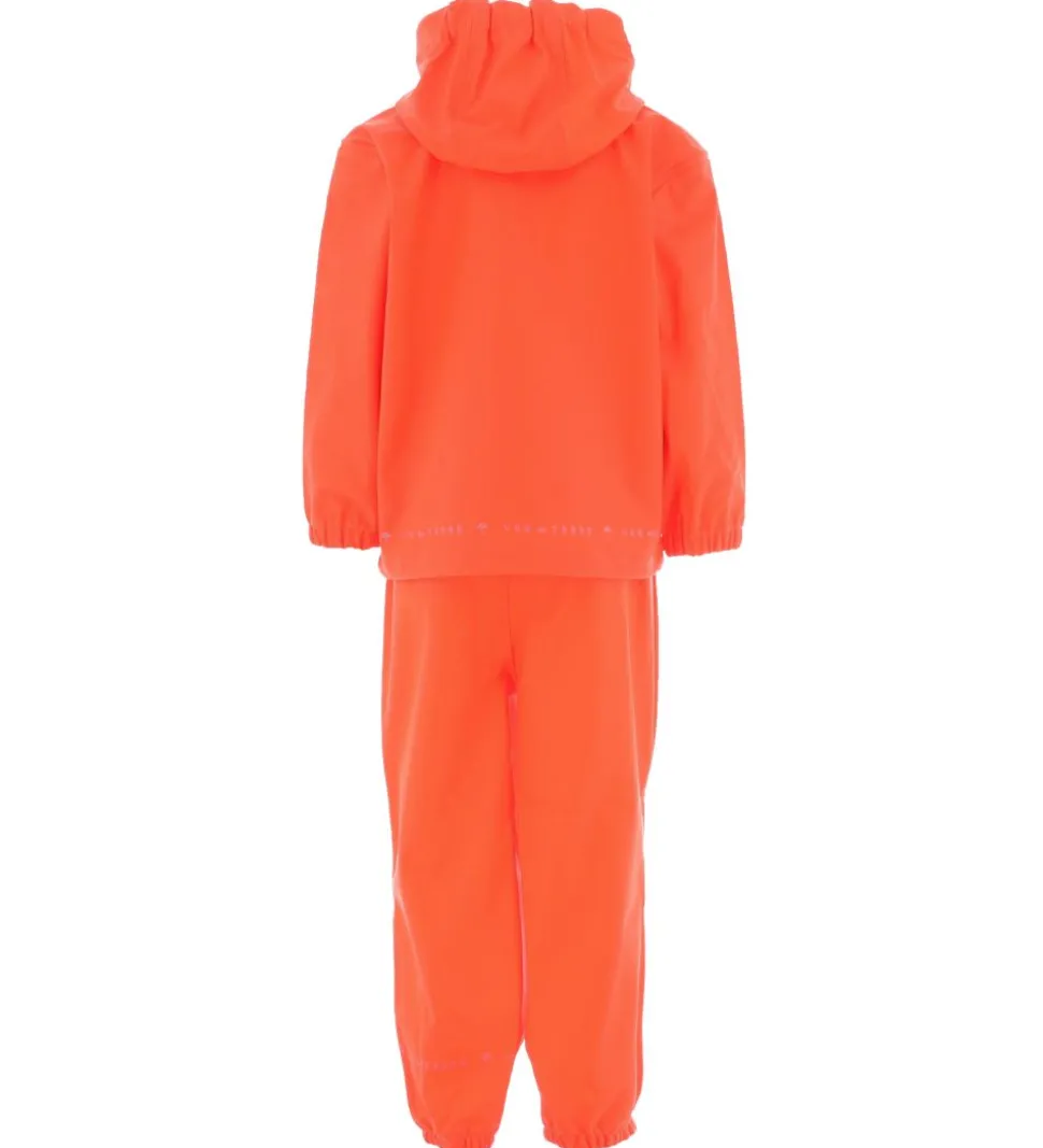 Smart Ver de Terre regntøj i neonorange PU. Sættet består af en regnjakke og et par regnbukser.