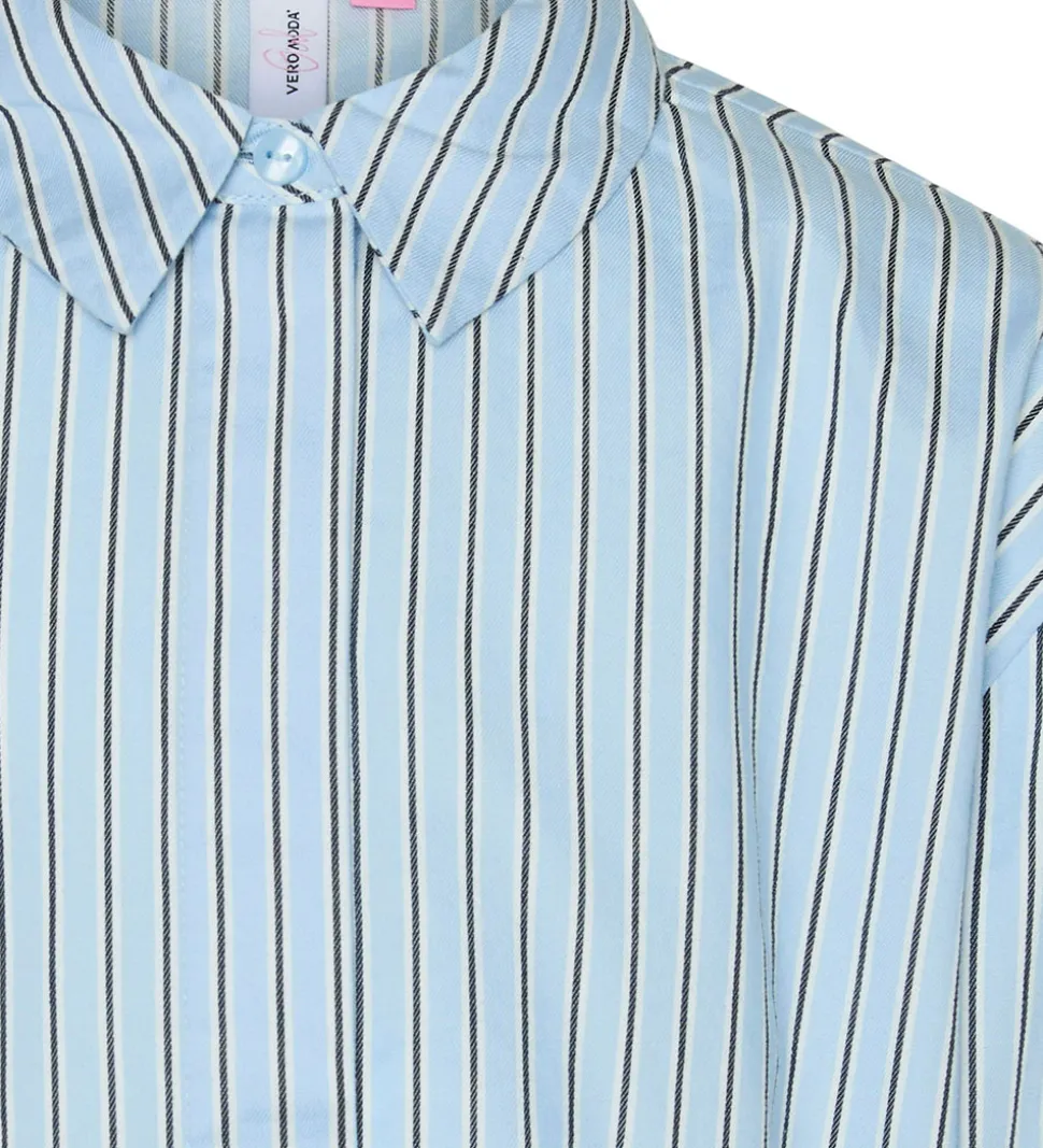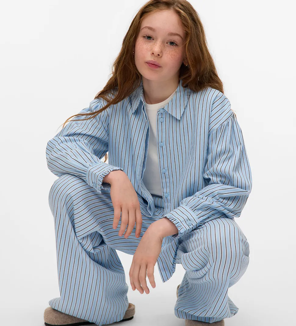 Elegant Vero Moda Girl skjorte med lange ærmer i en lys blå farve med fine striber i mørkere nuancer. Skjorten har en klassisk krave og smukke detaljer ved ærmerne, der giver en let og stilfuld effekt.