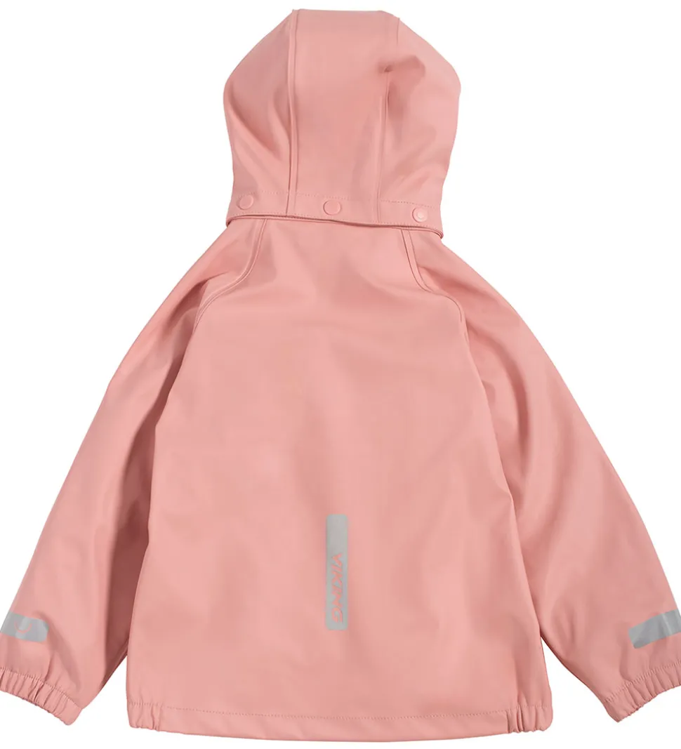 Lækkert Viking regntøj bestående af en regnjakke og et par regnbukser med seler i ensfarvet, rosa PU med reflekslogo og mange refleksdetaljer.
