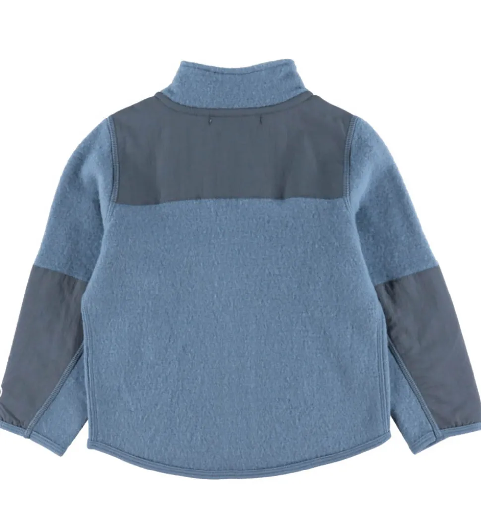 Skøn fleecejakke af merinould fra Voksi med lange ærmer i en støvet blå nuance og med detaljer af blågråt, glatvævet nylon. Fleecejakken har en lynlås foran og Voksi-logoet på ærmet, hvilket giver et stilfuldt touch.