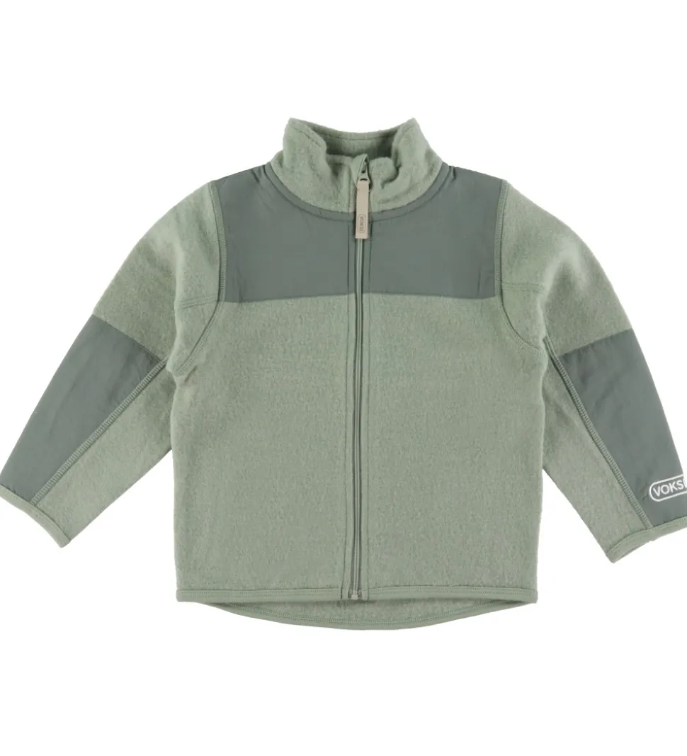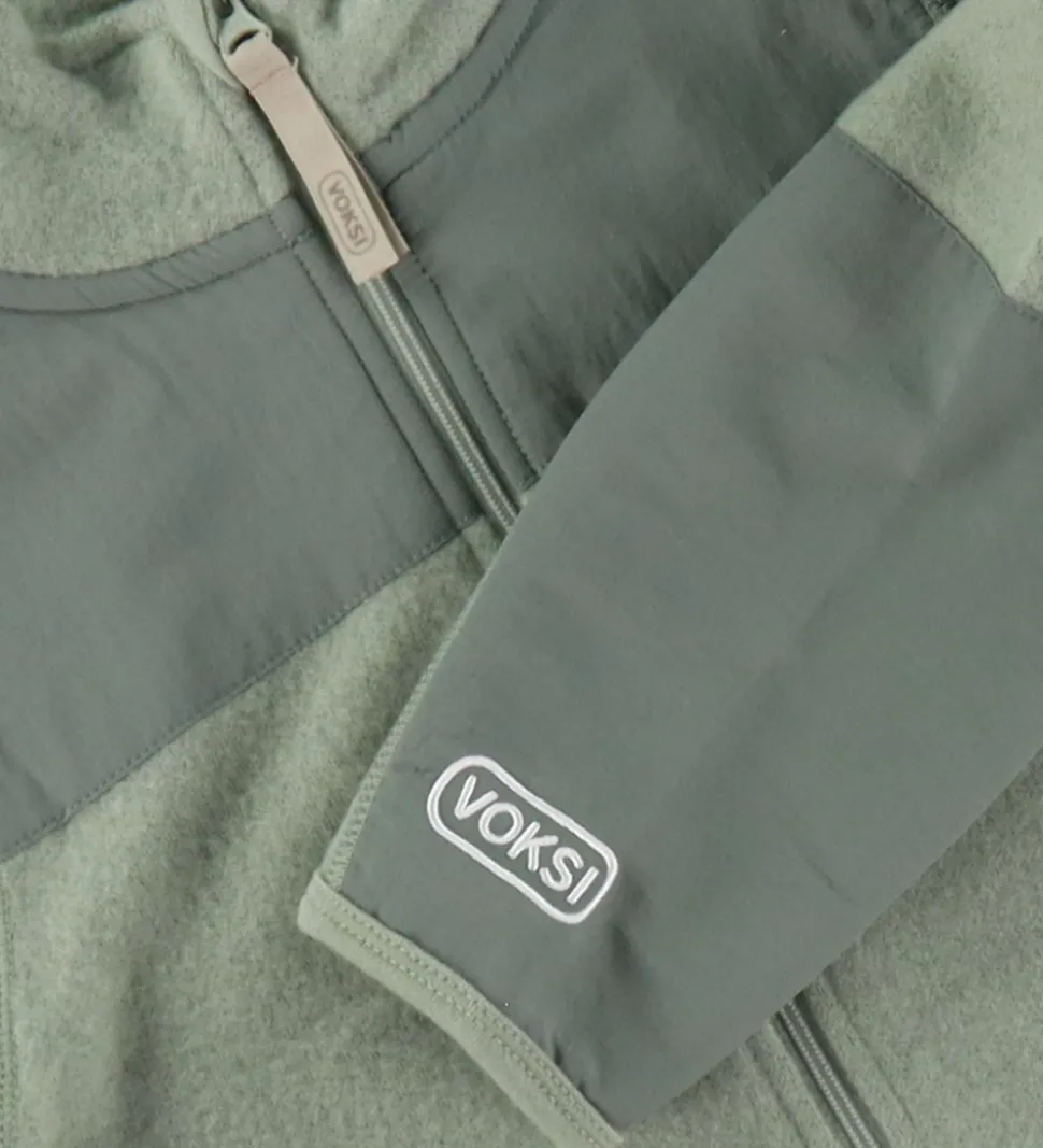Praktisk fleecejakke af uld fra Voksi med lange ærmer i en lys grøn nuance og med detaljer af glatvævet nylon. Fleecejakken har en lynlås foran og Voksi-logoet på ærmet, hvilket giver et stilfuldt touch.